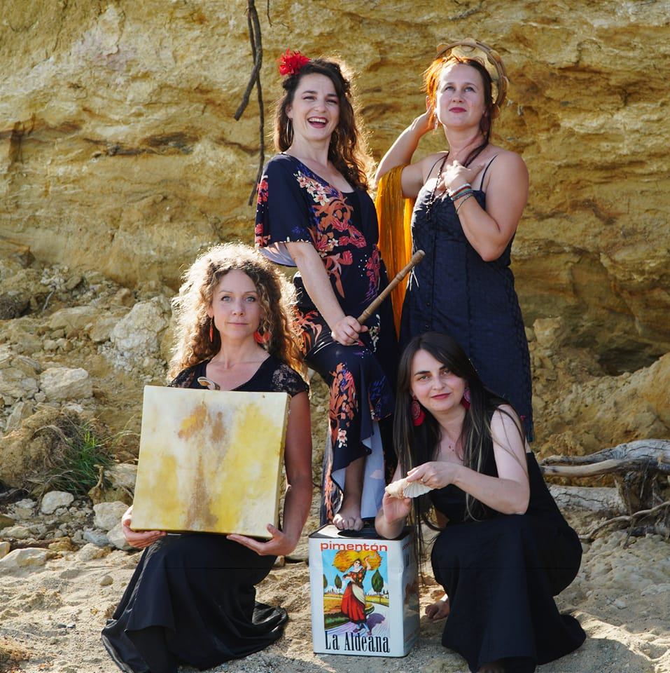 Enagua, ce sont quatre musiciennes passionnées qui vous transportent dans un patrimoine musical ibérique ! Au son de leurs percussions et de leurs voix chaleureuses, venez vous déhancher sur le charro et la jota, vibrer devant la puissance de la muiñieira et de las corraleras, vous émouvoir devant la joie nostalgique d’un répertoire traditionnel refleurissant Un voyage autour de la péninsule du soleil, un hommage à toutes les cultures musicales espagnoles.