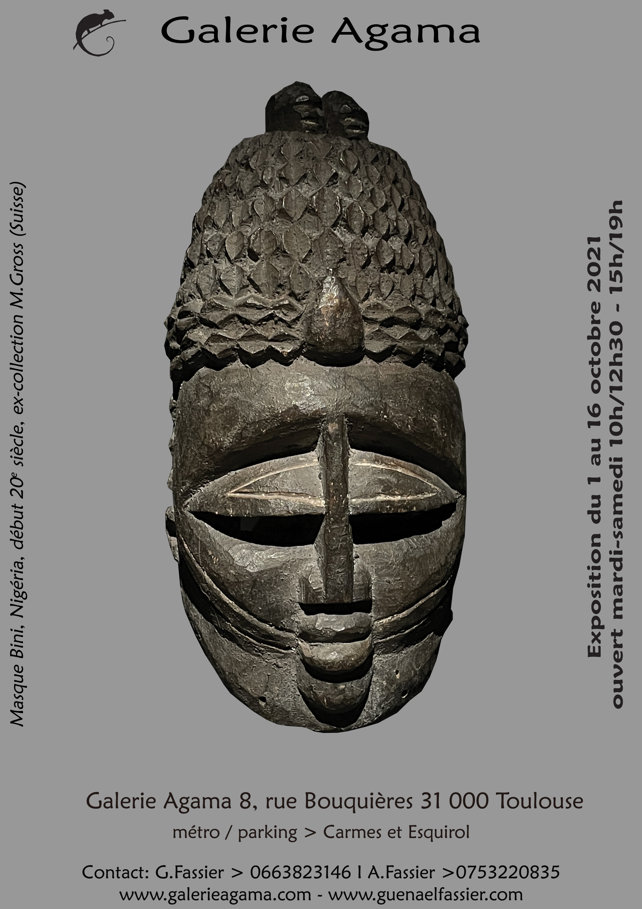 Du 1 au 16 octobre 2021, nous vous présentons nos nouvelles acquisitions d’art premier. Cette exposition mettra à l’honneur la sculpture traditionnelle des cultures d’Afrique de l’ouest, avec une sélection importante de masques du Nigéria dont cet ancien masque portrait Bini provenant d’une collection privée suisse et acquis auprès de la galerie Kunzi (Solothurn) en 1965.
