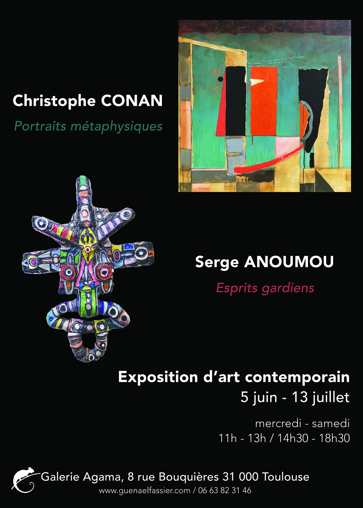 Cet été, la galerie Agama a le plaisir de présenter, du 5 juin au 13 juillet, les œuvres de deux plasticiens, dont les travaux respectifs se croisent et se répondent dans un jeu de matière, de couleur et de forme. D’une part, les peintures de la dernière série « Portraits métaphysiques » de Christophe Conan, artiste français, ainsi que quelques sculptures issues de sa série « Nature vivante ». D’autre part, les sculptures de Serge Anoumou, artiste togolais qui expose pour la première fois en France, ses « Esprits gardiens ». L’exposition a lieu en marge du festival de création contemporaine « Nouveau Printemps », qui prend ses quartiers cette année le quartier des Carmes / Saint-Etienne.