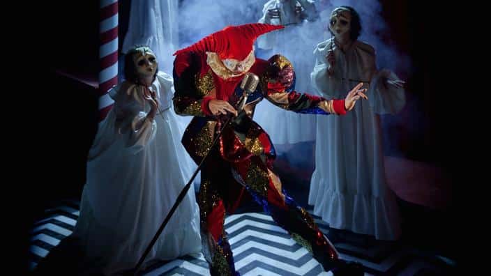 La Cie L’éternel été et Lucernaire diffusion présentent Fantasio / Mise en scène et scénographie : Emmanuel Besnault / Avec : Victor Duez (Marinoni, aide de camp du prince), Emmanuel Besnault (Fantasio), Élisa Oriol (Princesse Élisabeth), Deniz Türkmen (La gouvernante et Spark), Manuel le Velly (Le prince de Mantoue) / Assistante, masques et accessoires : Juliette Paul / Lumières : Cyril Manetta /Costumes et maquillages : Valentin Perrin / Production : Cie L’Éternel Été / Partenaires : Ville de Versailles, Festival le mois Molière, La Factory Avignon, Festival Friscènes, Belcastel En Scène