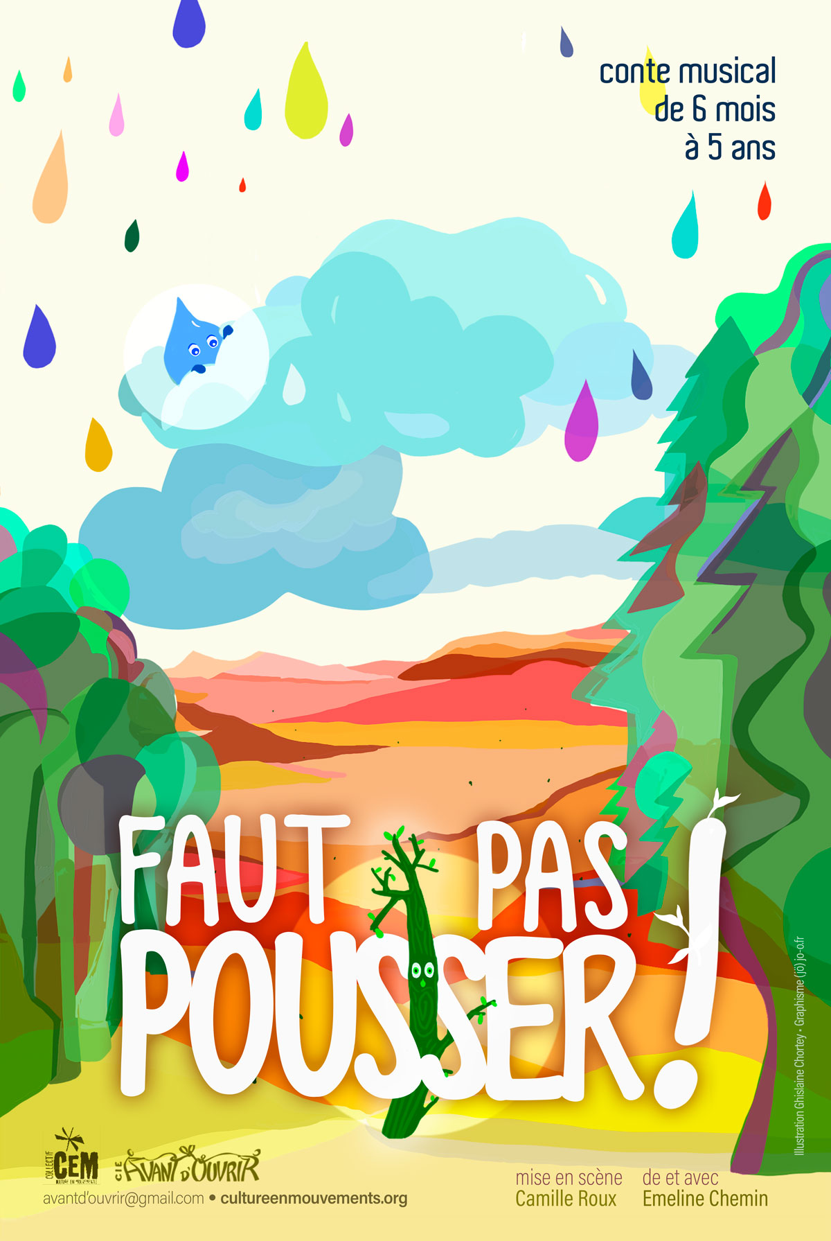 Dans le nuage au dessus d’elle, une goutte dodue attend. La marionnettiste et la petite graine devront lui trouver un chapeau et une bouée, avant que la petite goutte avoue enfin sa grande angoisse : elle a le vertige, et a peur de sauter !