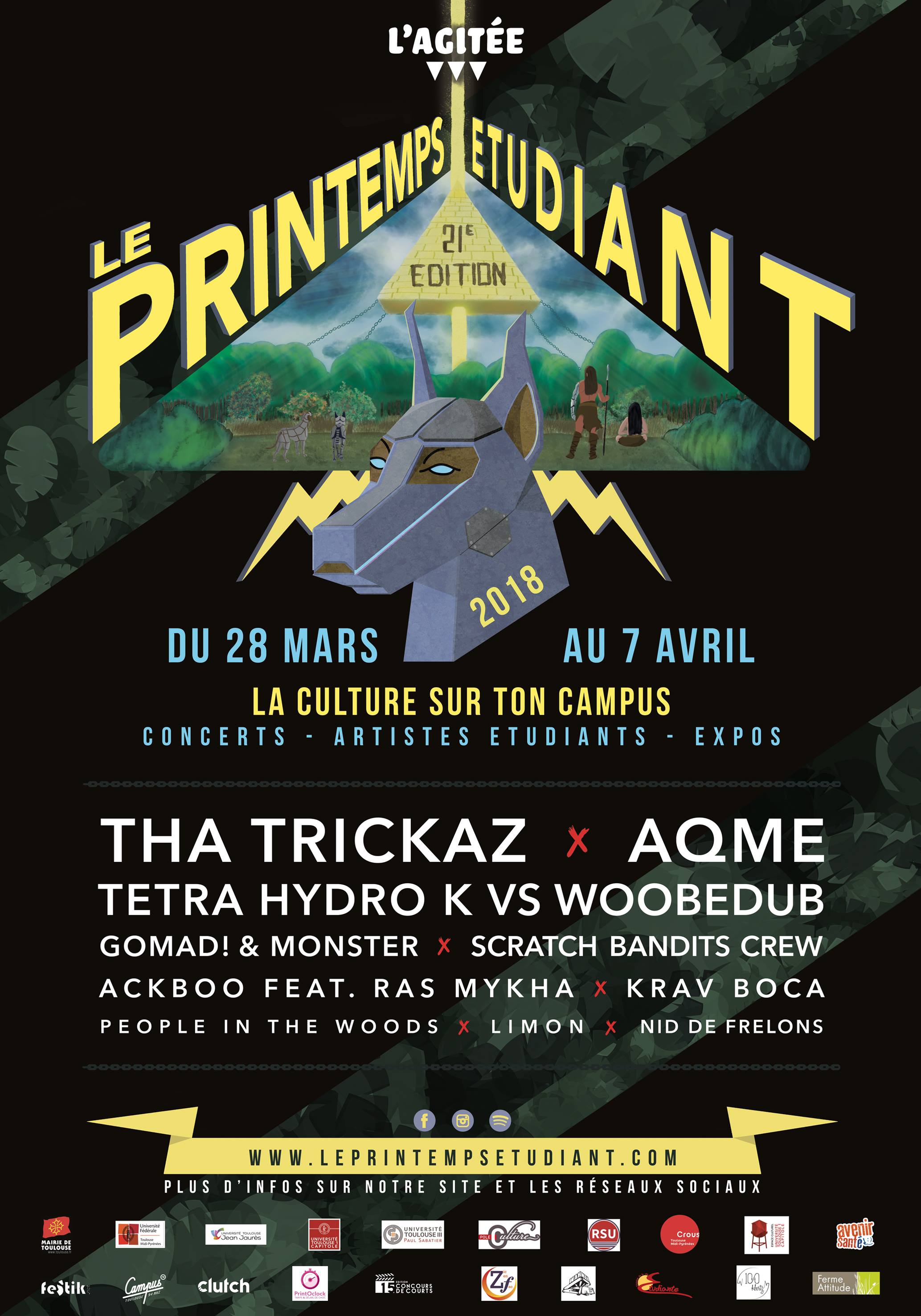 Pour inaugurer une nouvelle décennie de festival, L’Agitée se montre ambitieuse et étend Le Printemps Étudiant sur deux semaines, du Mercredi 28 Mars au Samedi 7 Avril, au sein des trois universités de Toulouse : Capitole, Jean Jaurès et Paul Sabatier. Ainsi, le festival s’installera d’abord les journées des Mercredi 28 et Jeudi 29 Mars sur le campus de Paul Sabatier, avant de s’y conclure le Vendredi 30 par une soirée concert à la salle Le CAP. C’est à l’Université Capitole, sur le campus de l’Arsenal, que Le Printemps Étudiant viendra ensuite s’établir les journées des Mardi 3 et Mercredi 4 Avril, puis à l’Université Jean Jaurès ce même Mercredi, ainsi que le Jeudi 5. Enfin, le festival se terminera en grande pompe les Vendredi 6 et Samedi 7 Avril à l’occasion d’une double soirée de clôture en extérieur sur ce même campus.
