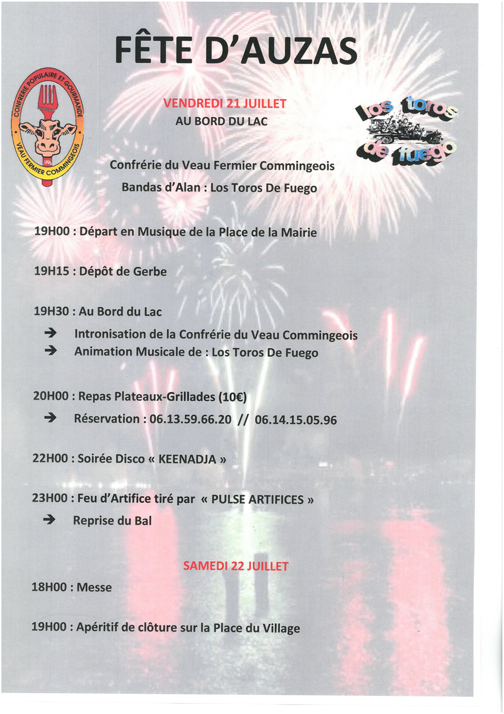 Le Vendredi 21 juillet et Samedi 22 juillet, se tiendra lieu la fête d’Auzas animé par la bandas « Los Toros De Fuego »d’Alan.Le Vendredi, à 19 H, aura lieu le départ en musique de la Place de la Mairie. A 19 H 15, un dépôt de Gerbe. A 19 H 30, au bord du lac, une intronisation de la Confrérie du Veau Commingeois animé par « Los Toros de Fuego ». A 20H, un repas vous sera servie (plateau-grillades) pour 10 € ;Réservation aux 06.13.59.66.20 ou 06.14.15.05.96. A 22 H, une soirée disco sera animée par « KEENADJA »et à 23 H sera tiré le feu d’Artifice par « pulse artifices ».Le Samedi, à 18 H aura lieu la messe et à 19 H un apéritif de clôture sur la place du Village