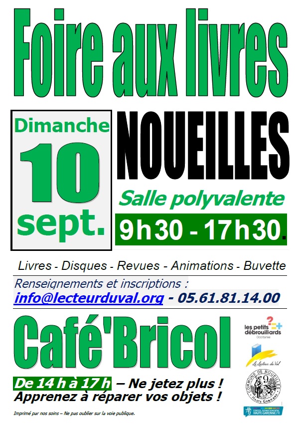 Dans le cadre d’une journée dédiée au réemploi, le Lecteur du Val, en partenariat avec la médiathèque de Noueilles, organise sa 17ème Foire aux Livres d’occasion (et disques vinyles) le dimanche 10 septembre 2023, de 9 h 30 à 17 h 30, à la salle polyvalente de Noueilles. Les bibliothèques qui le souhaitent y tiendront leur propre stand et les vendeurs amateurs de livres en tous genres ainsi que d’autres supports habituellement disponibles dans les médiathèques (revues, cd-audio, vinyles, DVD) sont également invités à s’inscrire (arrivée des vendeurs à partir de 8 h 30).