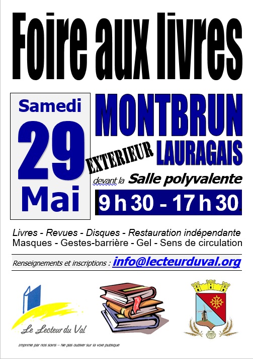 Le Lecteur du Val organise sa 15e Foire aux Livres et aux disques (vyniles, CD, DVD) le samedi 29 mai 2021 en extérieur (contraintes sanitaires obligent) autour de la salle polyvalente de Montbrun-Lauragais..