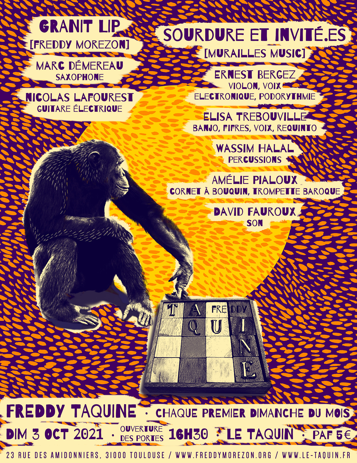 Freddy Taquine est un rendez-vous régulier à Toulouse à l’initiative des artistes du collectif Freddy Morezon et du Taquin, le 1er dimanche de chaque mois. Conçu comme un laboratoire, ce rendez-vous mensuel est l’occasion de concerts mais aussi d’expériences et de rencontres inédites, entre les musiciens, entre les musiques, entre les arts... C’est aussi l’occasion d’inviter des amis de collectifs pas si lointains, artistes-chercheurs, musiciens, bien sûr, mais aussi vidéastes, graphistes, plasticiens, danseurs... Mélanger les genres, les gens, et observer si la magie opère...