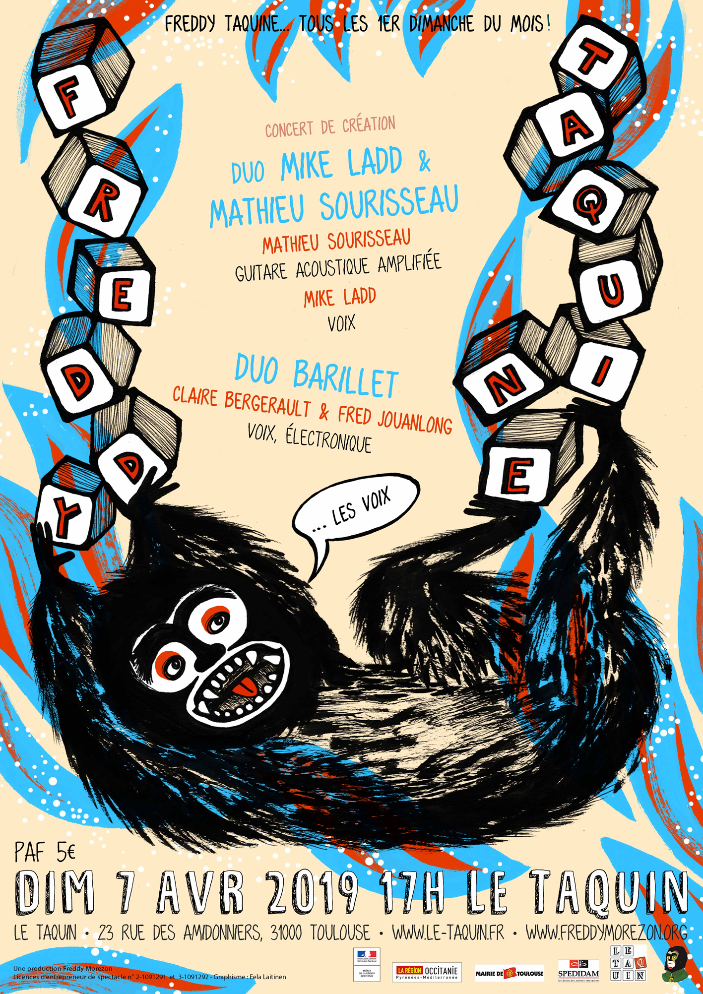 Dimanche 7 avril 2019, Freddy Taquine les voix. Celle, scandée, chantée, de Mike Ladd, nous emmenant du blues au hip-hop, déclinant ses textes sur les paysages que trace la guitare acoustique de Mathieu Sourisseau, dans leur duo en création ce début 2019, ou bien celles de Claire Bergerault et Fred Jouanlong, simplement traitées par leur nuancier de traitements électroniques, nous promenant avec Little Tighter dans un dialogue de sons à la fois détonant et admirable. Deux sublimes duos qui nous laisseront sans voix dimanche 7 avril au Taquin !