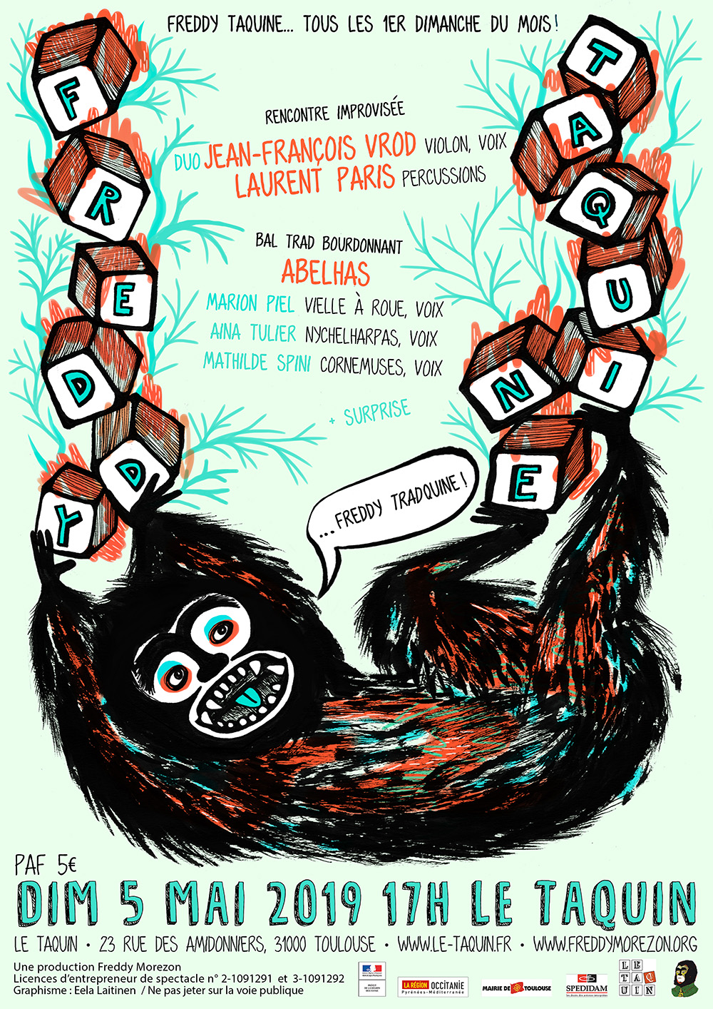 Dimanche 5 mai 2019, Freddy TRADquine, autrement dit Freddy Taquine le trad, avec une rencontre improvisée entre le violoniste Jean-François Vrod et le percussionniste Laurent Paris, suivie d’un bal trad à tendance bourdonnante avec Abelhas.