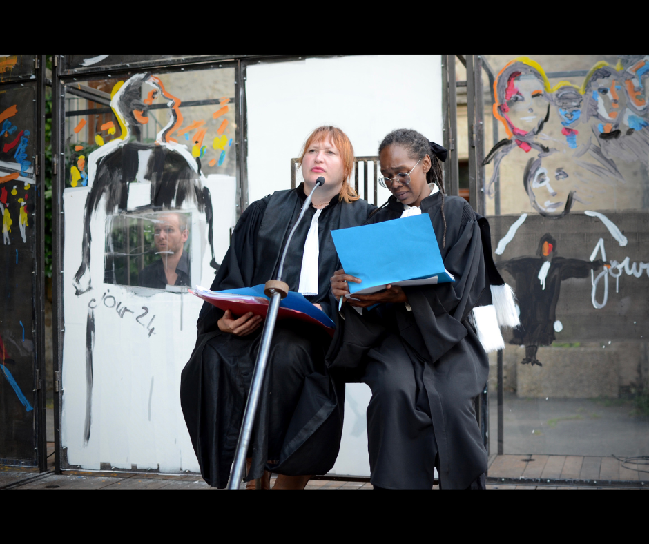 Une audience en temps réel, un tribunal à ciel ouvert au cœur de la ville. Quatre heures d’affaires, comme pour de vrai. Comparutions immédiates, audiences correctionnelles, affaires familiales, réunies en un jour et un lieu. Dix comédien·ne·s, musicien·ne·s, plasticien·ne·s, danseur·se·s incarnent tour à tour juges, prévenu·e·s, avocat·e·s, badaud·e·s ou policier·ère·s.