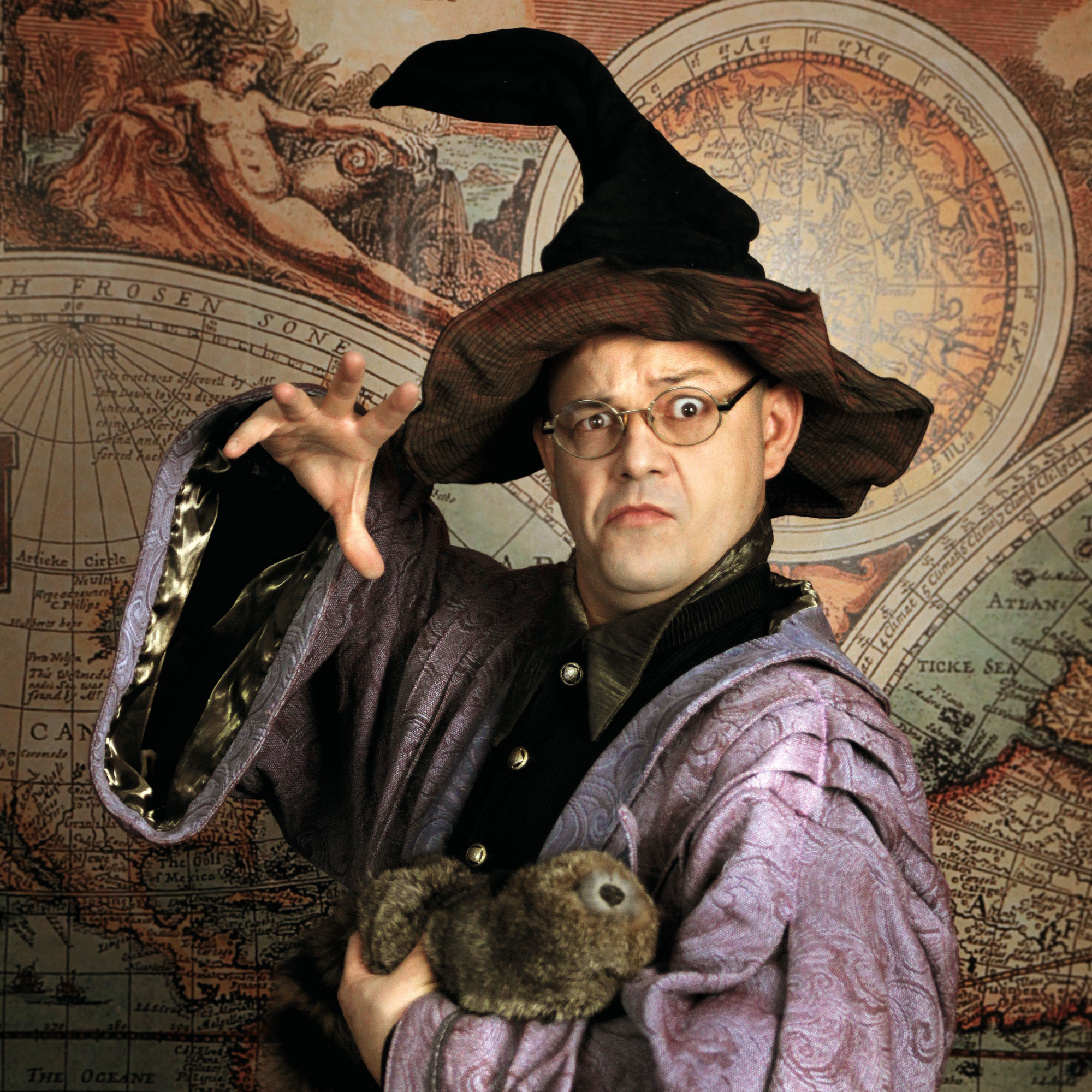 Dans un spectacle interactif, ce sorcier voyageur présente des expériences étranges défiant les lois de la physique : les objets passant au travers d’une vitre, des incantations pour fabriquer du brouillard, la véritable utilisation du bâton de pluie…