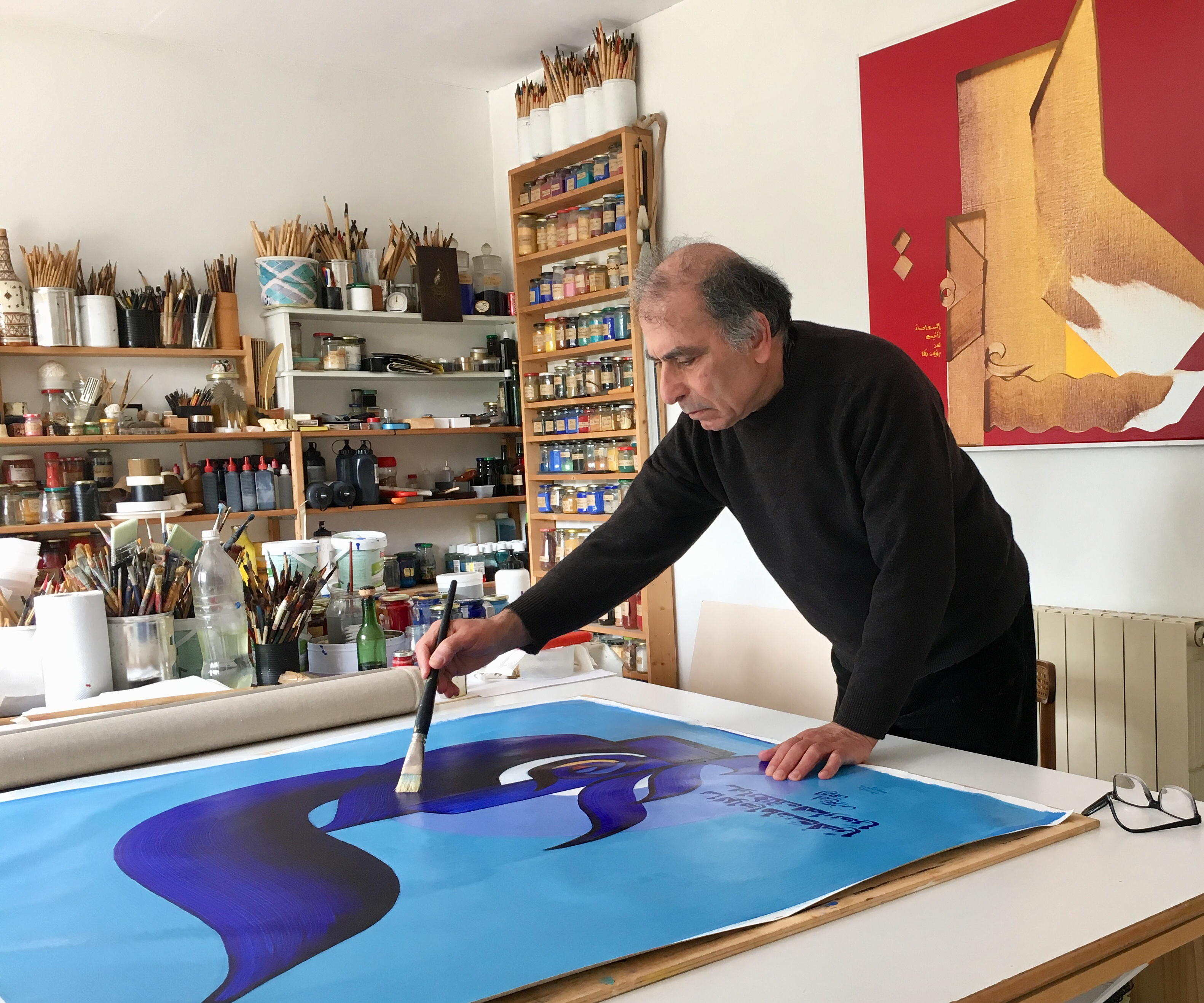 Façonné par ce double apprentissage, il creuse depuis plus de cinquante ans une voie singulière qui le pousse à s’émanciper du sens traditionnellement réservé à la calligraphie arabe, mais aussi de la forme, en ajoutant au calame la fabrication d’outils nouveaux. Épris de liberté et d’ouverture au monde, imprégné d’influences d’artistes de tous horizons, il invente une nouvelle manière de faire vivre la calligraphie sans perdre la mémoire de l’héritage. Il s’approprie les pensées de poètes et d’écrivains, fait évoluer le trait, se produit en direct, collabore avec des metteurs en scène, musiciens, chorégraphes. Suite à une importante donation de l’artiste à la Ville de Figeac, le musée Champollion lui consacre une grande exposition qui embrasse l’ensemble de sa carrière et affirme son statut de maître de la calligraphie moderne. MR
