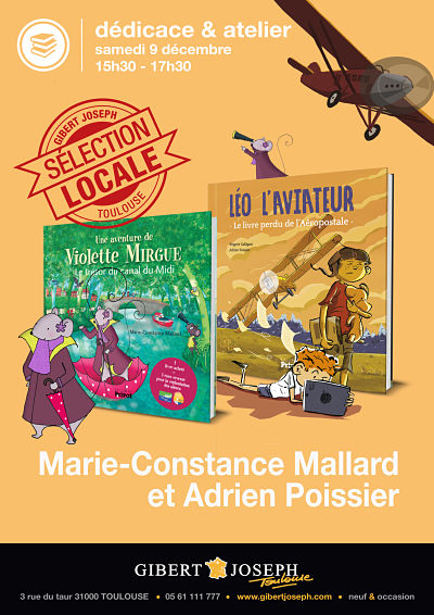Dans le cadre de notre mise en avant de la production locale pour les fêtes de Noël, nous avons le grand plaisir d’accueillir les Toulousains Marie-Constance Mallard et Adrien Poissier, auteure et dessinateur d’albums pour les plus jeunes, qui viendront dédicacer leurs dernières parutions, "Une aventure de Violette Mirgue, le trésor du canal du Midi" et "Léo l’aviateur, le livre perdu de l’Aéropostale" (tous deux aux éditions Privat), le samedi 9 décembre de 15h30 à 17h30 au rayon Jeunesse de notre librairie.