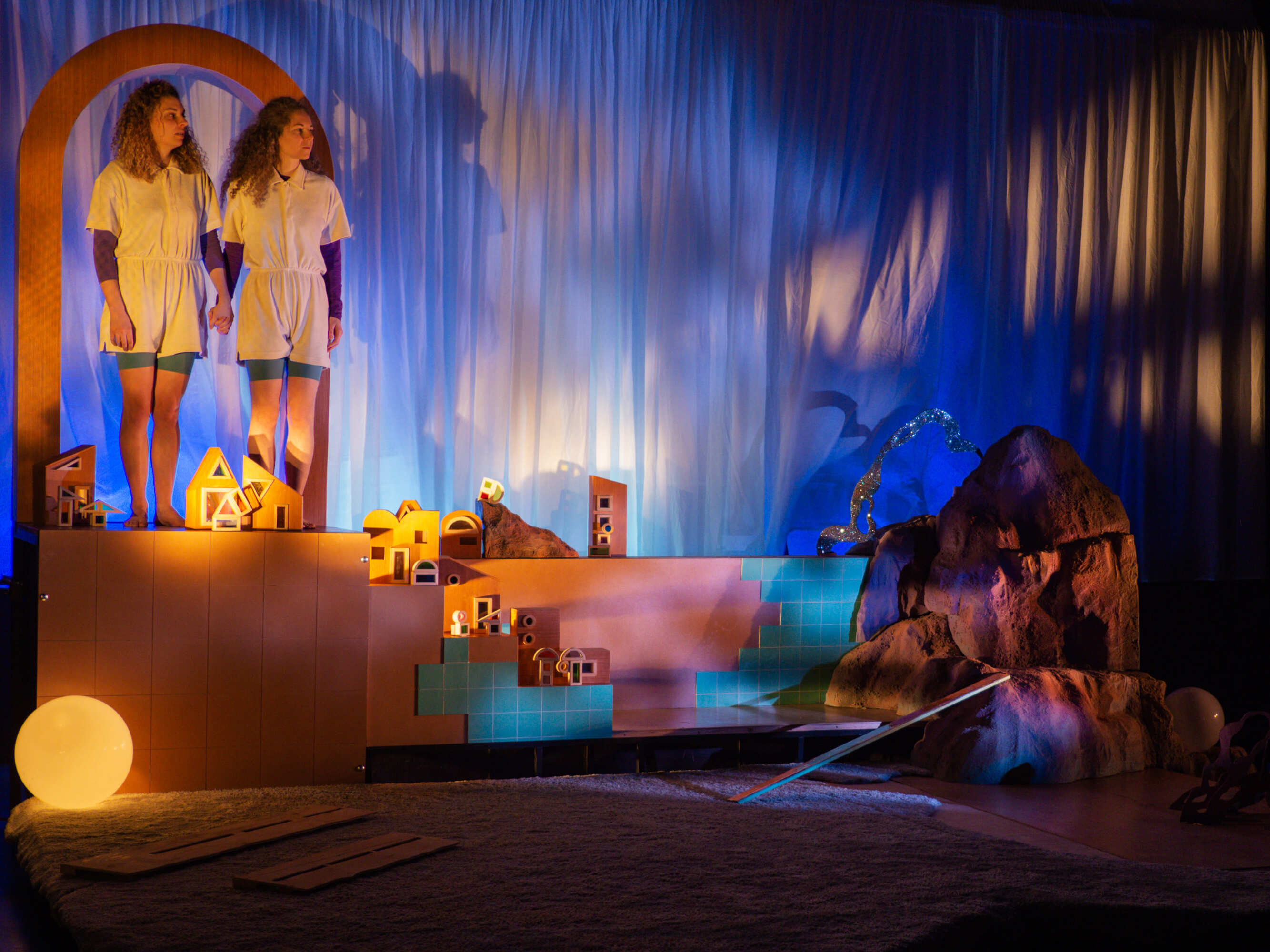 Au plateau, une forêt, une montagne, un village et une rivière dialoguent. Ici, tout semble paisible. Mais, si l’on regarde bien, entre les arbres et sous le ciel étrangement bleu, les maisons respirent et chuchotent. Habitant le décor, les deux interprètes font vivre à la fois le monde du dehors et celui du dedans. Les murs ont une bouche et la peau compte ses portes. Un secret devient murmure, le murmure devient rumeur… La rumeur devient parole libérée.
