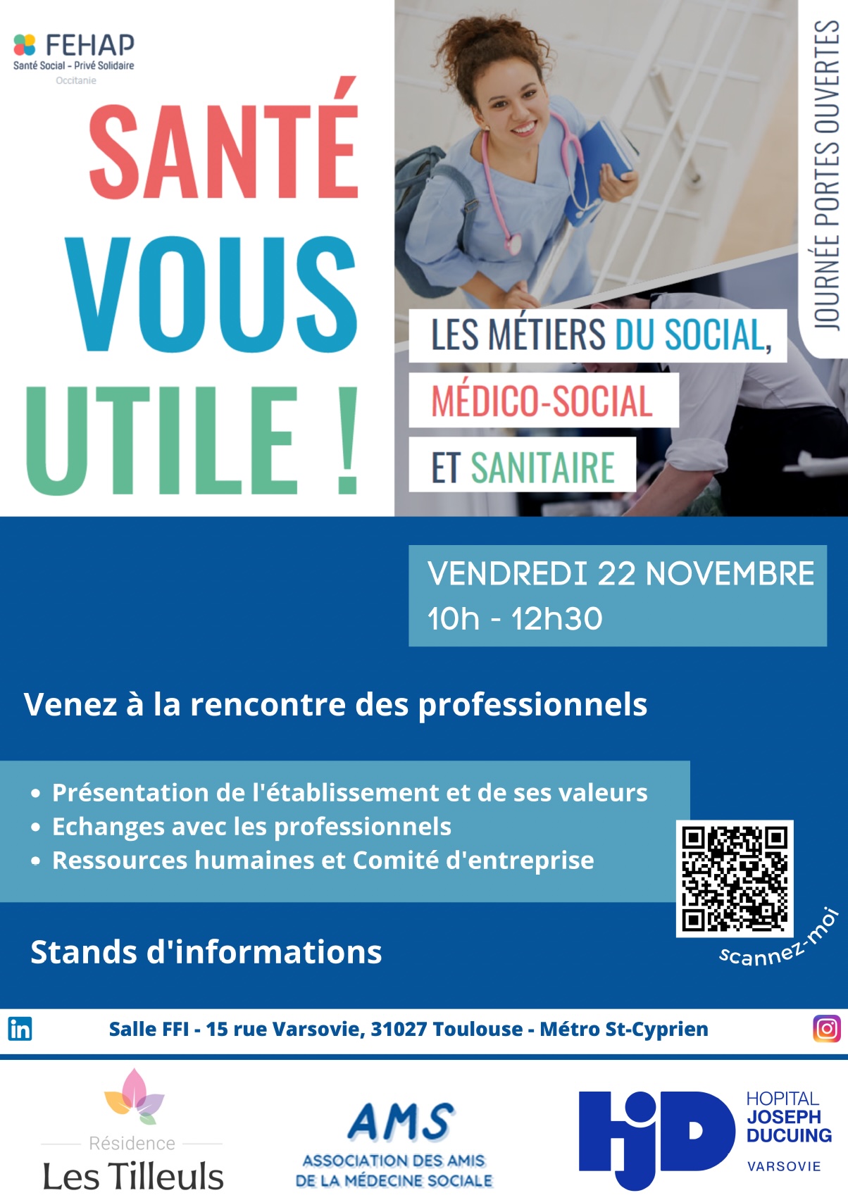 Vendredi 22 novembre, l’Hôpital Joseph Ducuing et la Résidence les Tilleuls* donnent rendez-vous aux lycéens, étudiants, demandeurs d’emploi et aux personnes en reconversion professionnelle afin de leur faire découvrir leurs métiers (du social, médico-social et sanitaire).