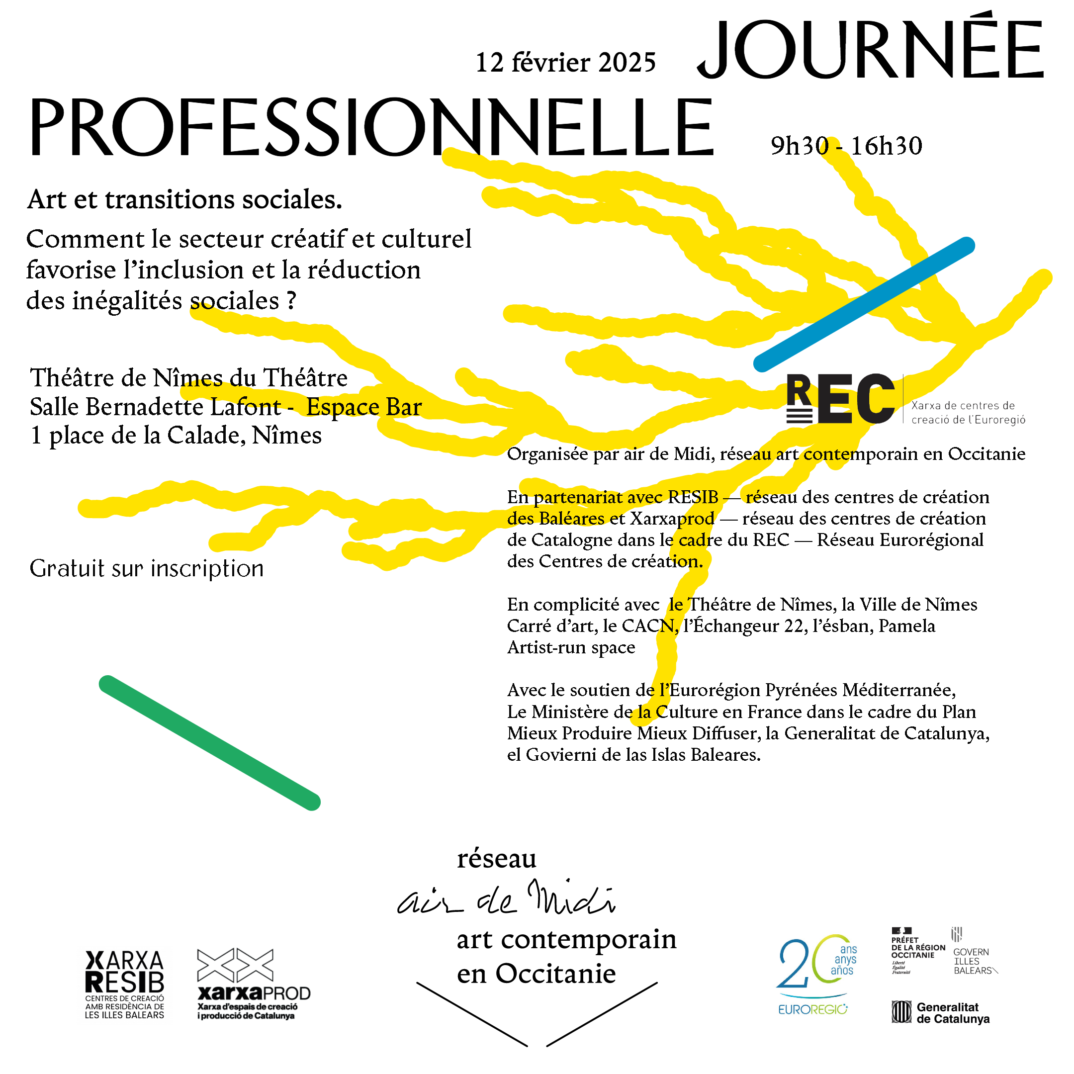 Air de Midi, réseau art contemporain en Occitanie en partenariat avec RESIB — réseau des centres de création des Baléares et Xarxaprod — réseau des centres de création de Catalogne, dans le cadre du REC — Réseau Eurorégional des Centres de création, ont le plaisir de vous inviter à une Journée Professionnelle dédiée à l’art et aux transitions sociales, qui se tiendra à Nîmes le 12 février 2025.