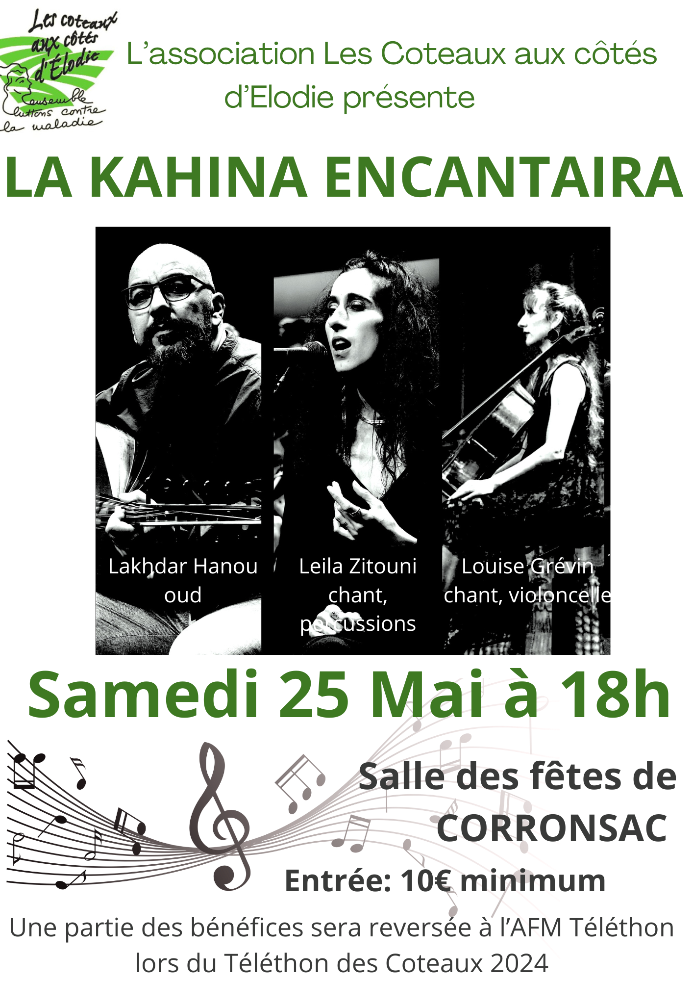 l’association « Les coteaux aux côtés d’Élodie » Entrée : 10€ minimum, une partie des fonds sera reversée à l’AFM Téléthon. Réservation souhaitée de préférence par SMS au 06 11 73 45 67 ou par mail à lescoteaux.elodie@gmail.com .