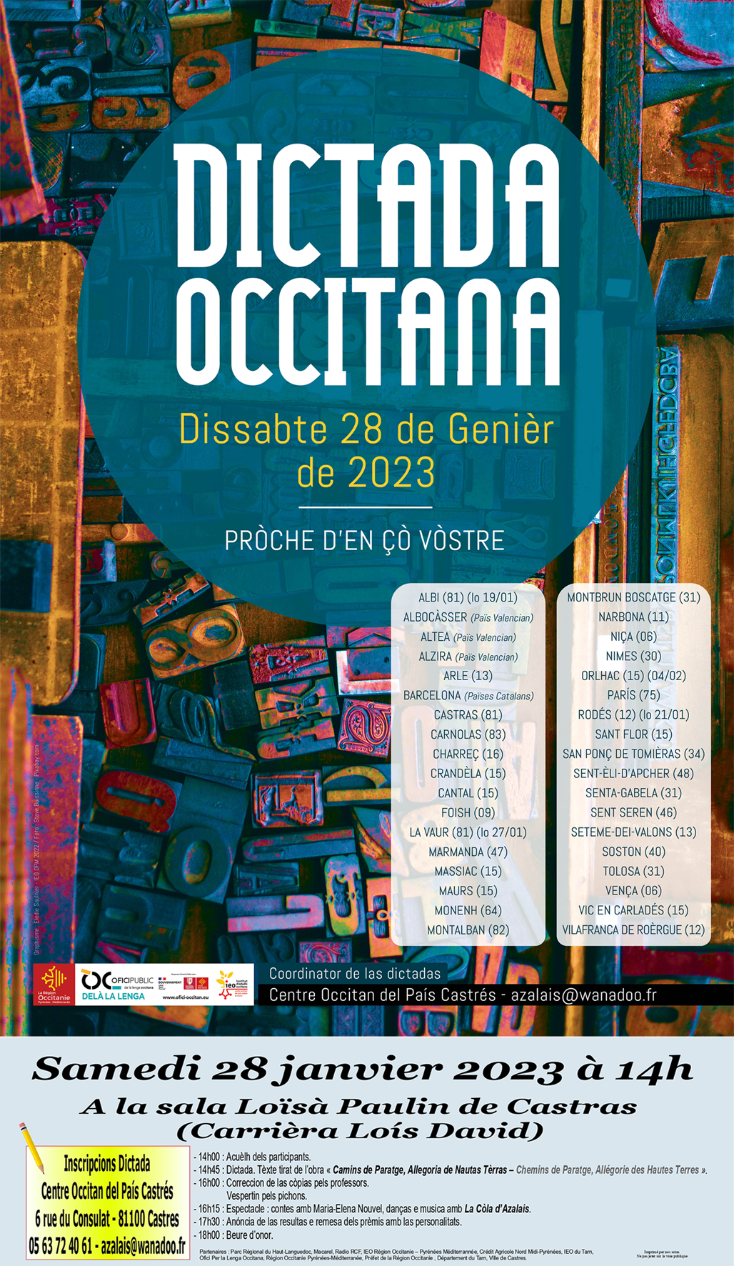 Les inscriptions à cette Dictada Occitana doivent être effectuées avant le 26 janvier 2023 auprès du Centre Occitan del País Castrés (05 63 72 40 61) / azalais@wanadoo.fr.
