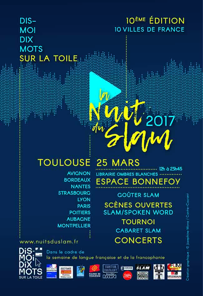 La Nuit du Slam 2017 s’annonce tout en démesure avec la participation inédite de 10 villes de France : Paris, Nantes, Strasbourg, Bordeaux, Poitiers, Lyon, Toulouse, Montpellier, Avignon et Aubagne, qui accueilleront des programmations Slam et Spoken Word savamment concoctées par les collectifs organisateurs, coordonnés cette année par l’association toulousaine Contre-Courant, et inspirées par la recette qui assure le succès de l’événement depuis ses premières heures :