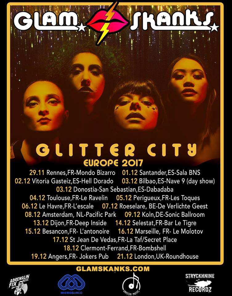 On est pile-poil dans l’esprit des premières heures du Punk, installées dans la ville des Runaways, sous perfusion de leurs sœurs aînées, passionnées par le Glam et le Rock du début 70’s, influencées par les T.Rex, David Bowie, New York Dolls ou encore The Sweet avec la dramaturgie d’ Alice Cooper et la sensibilité Rock de Aerosmith, elles ont su créer une extravagance audiovisuelle colorée qui est enveloppée dans un cosmétique à la Rocky Horror Show .. Elles ravagent tout sur leur passage : entre backing band et enregistrements de titres avec Johnny Depp pour des bandes originales de films, ou des premières parties de Cherie Currie et Alice Cooper, ou encore des tournées Anglaises et Américaines en support de ADAM ANT .. Vous l’avez bien compris, en quelques mois le groupe a su créer le buzz aux USA et elles ne souhaitent pas en rester là alors planquez-vous les mecs, les GLAM SKANKS débarquent pour la première fois en France !