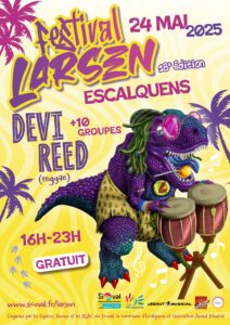 Le Festival Larsen, événement musical emblématique du territoire du Sicoval, revient pour une 18ème édition le samedi 24 mai 2025 de 16h à 23h, sur l’aire de grand jeu du gymnase Alice Milliat à Escalquens.
