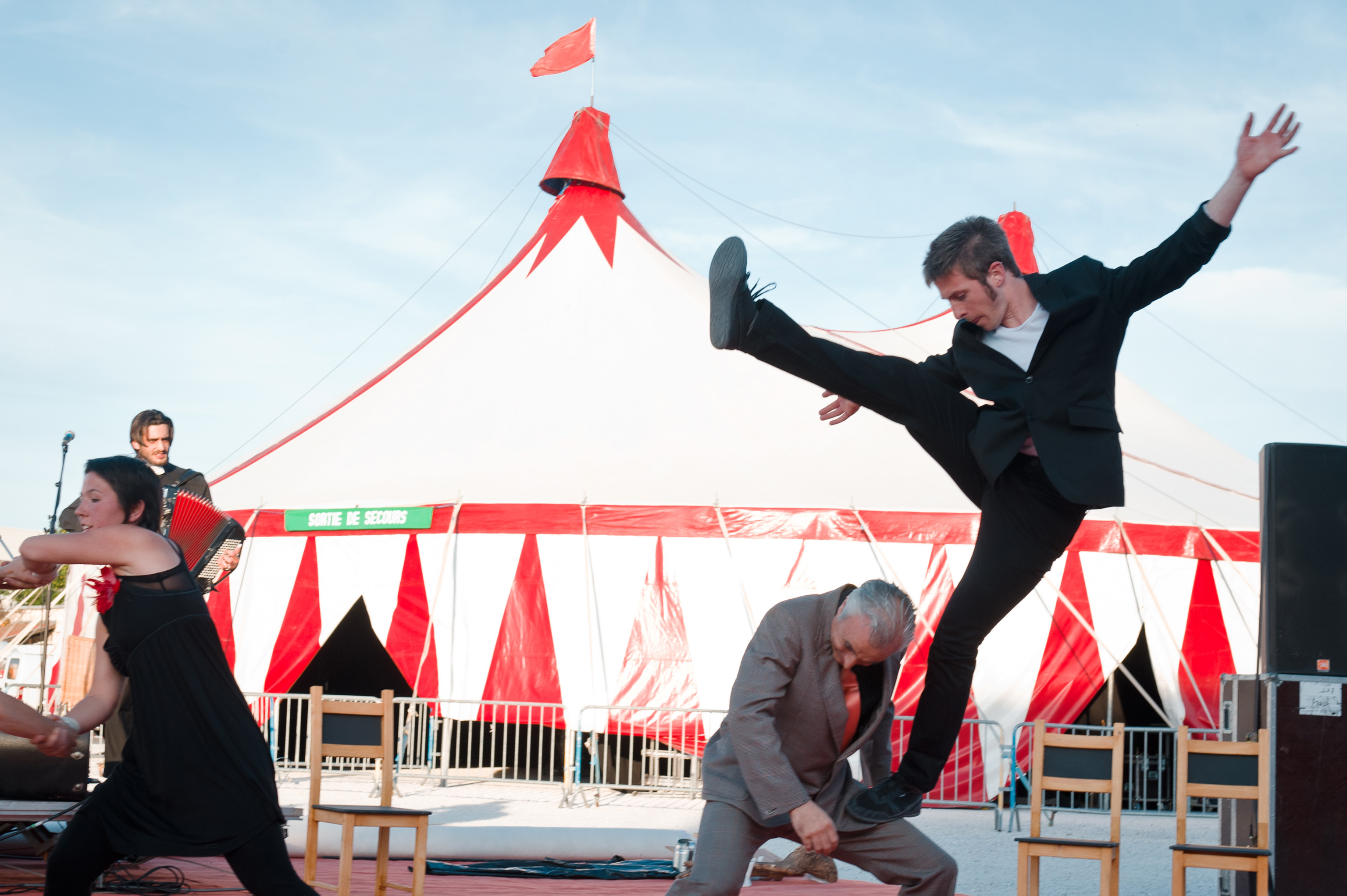 Un bal, qui se métamorphose en fonction des lieux et des publics. Les artistes se mêlent aux spectateurs, un circassien évolue avec les danseurs, tous ensemble fabriquent des saynètes ludiques sur les compositions musicales. Quelques éléments plastiques permettent au public de comprendre les règles de jeu et d’intervenir dans la danse.