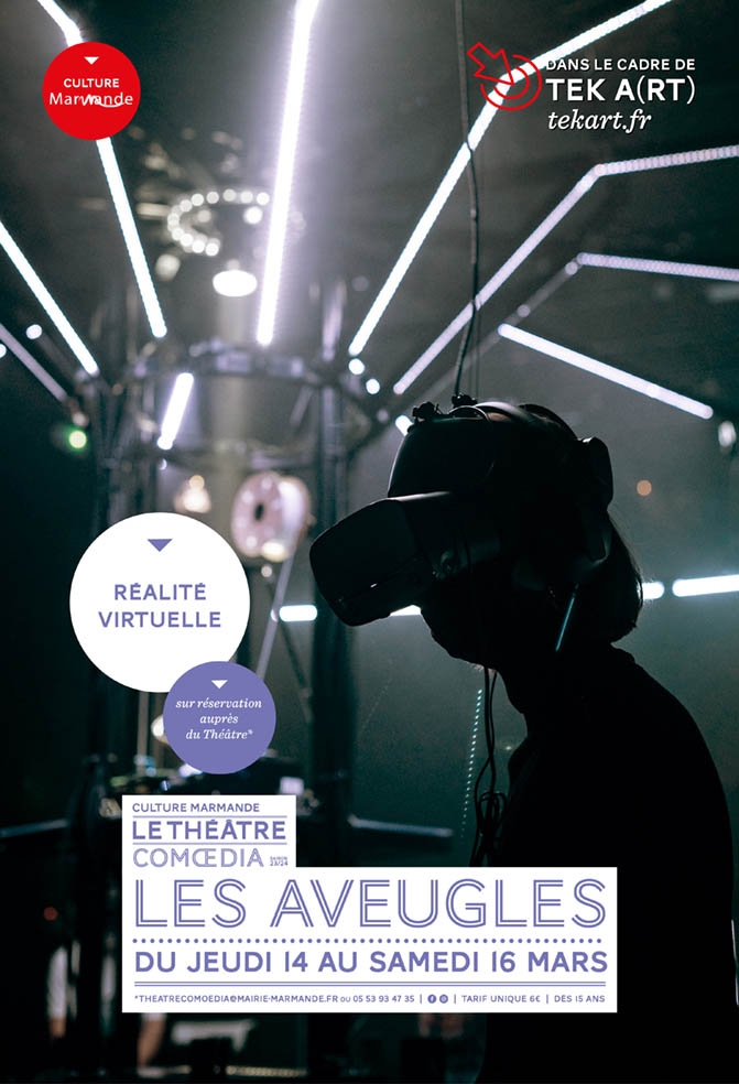 En adaptant ce célèbre texte de Maurice de Maeterlinck, INVIVO poursuit sa vision d’un théâtre hybride. Sur scène les douze spectateurs, équipés de casques à réalité virtuelle, sont plongés dans un univers brut et poétique. Une expérience d’immersion collective mettant en lumière le message intemporel de la pièce : nous sommes tous des aveugles en quête d’une forme de guide.