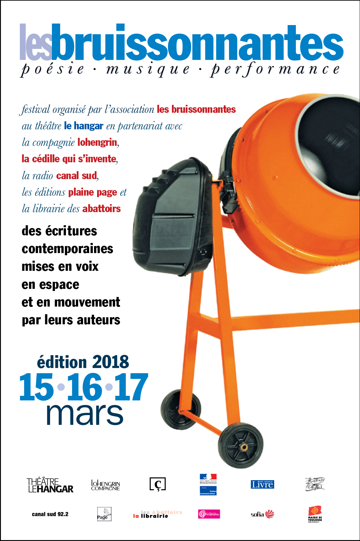 Les Bruissonnantes est un festival dédié aux écritures contemporaines mises en voix, en espace et en mouvement par leurs auteurs. Organisé dans le cadre de la manifestation nationale le Printemps des Poètes, il se déroule au théâtre Le Hangar à Toulouse trois soirées durant et donne à entendre « le » poème dans une grande diversité de formes : performances, poésie sonore, lectures intimistes, écritures vocales et musicales. Par ce décloisonnement, il est question d’exposer les enjeux qui traversent les écritures contemporaines dans leur volonté d’inventer ou de révéler un sens concret, polyphonique et sensible.