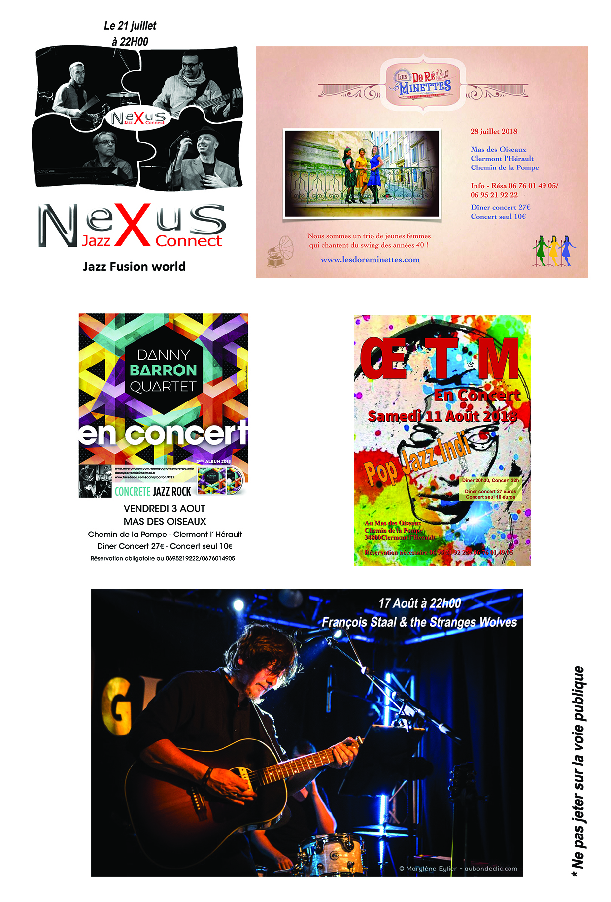 Vous trouverez ci-joint la programmation de l’association le Centre des Arts Pluriels ’’ CAP ’’ au Mas des Oiseaux chemin de la Pompe à Clermont- l’Hérault.