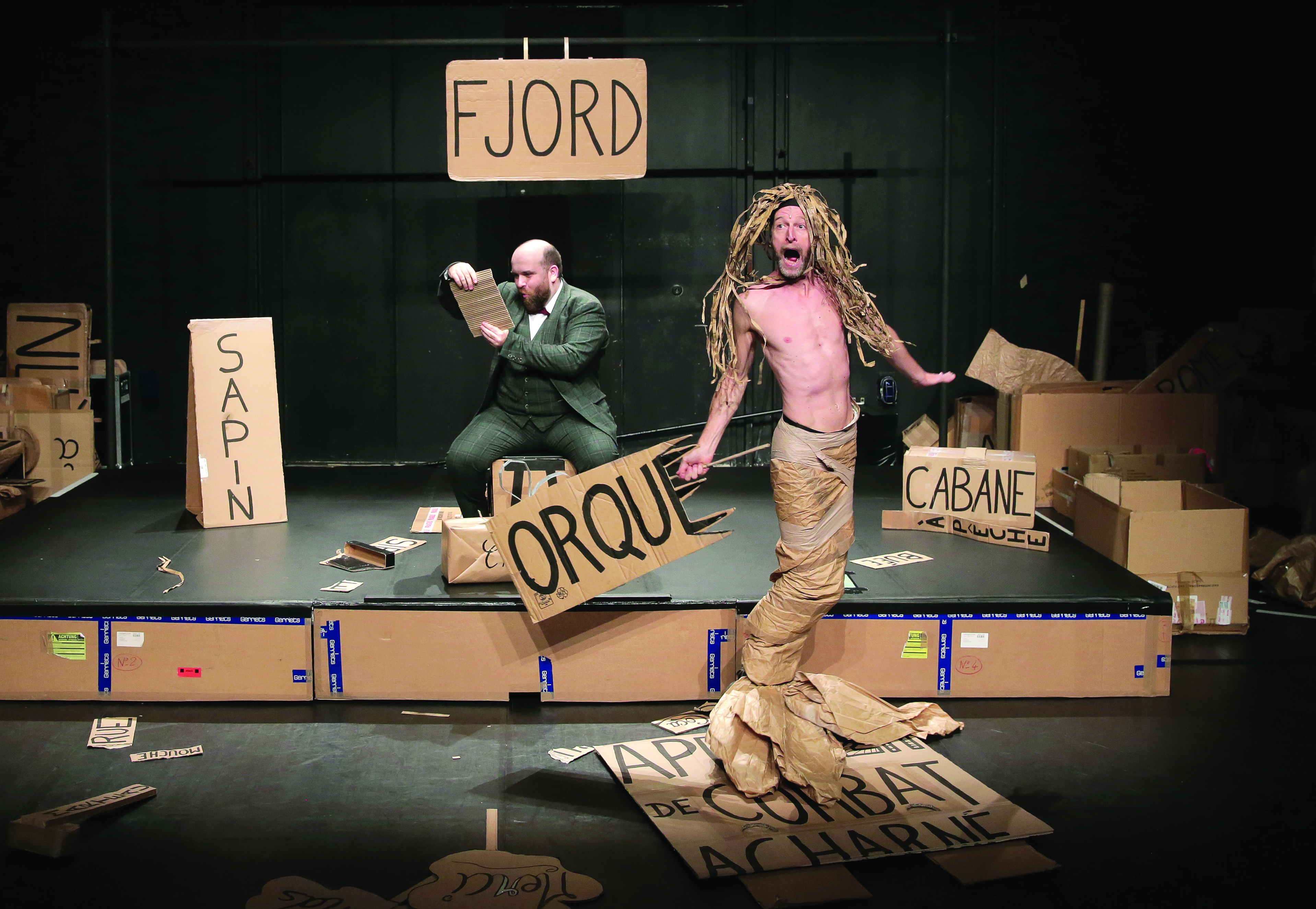 Ceux qui pensaient avoir tout vu iront se moucher, mais discrètement. En fait, c’est descriptible, il y a des pancartes (en carton) pour bien expliquer car l’histoire est à rebondissements, entre l’Écosse et l’épopée shakespearienne. L’un est en maillot de bain, l’autre en costume, c’est farfelu, loufoque, truffé de trouvailles ; un spectacle créé par Olivier Martin-Salvan et Pierre Guillois.