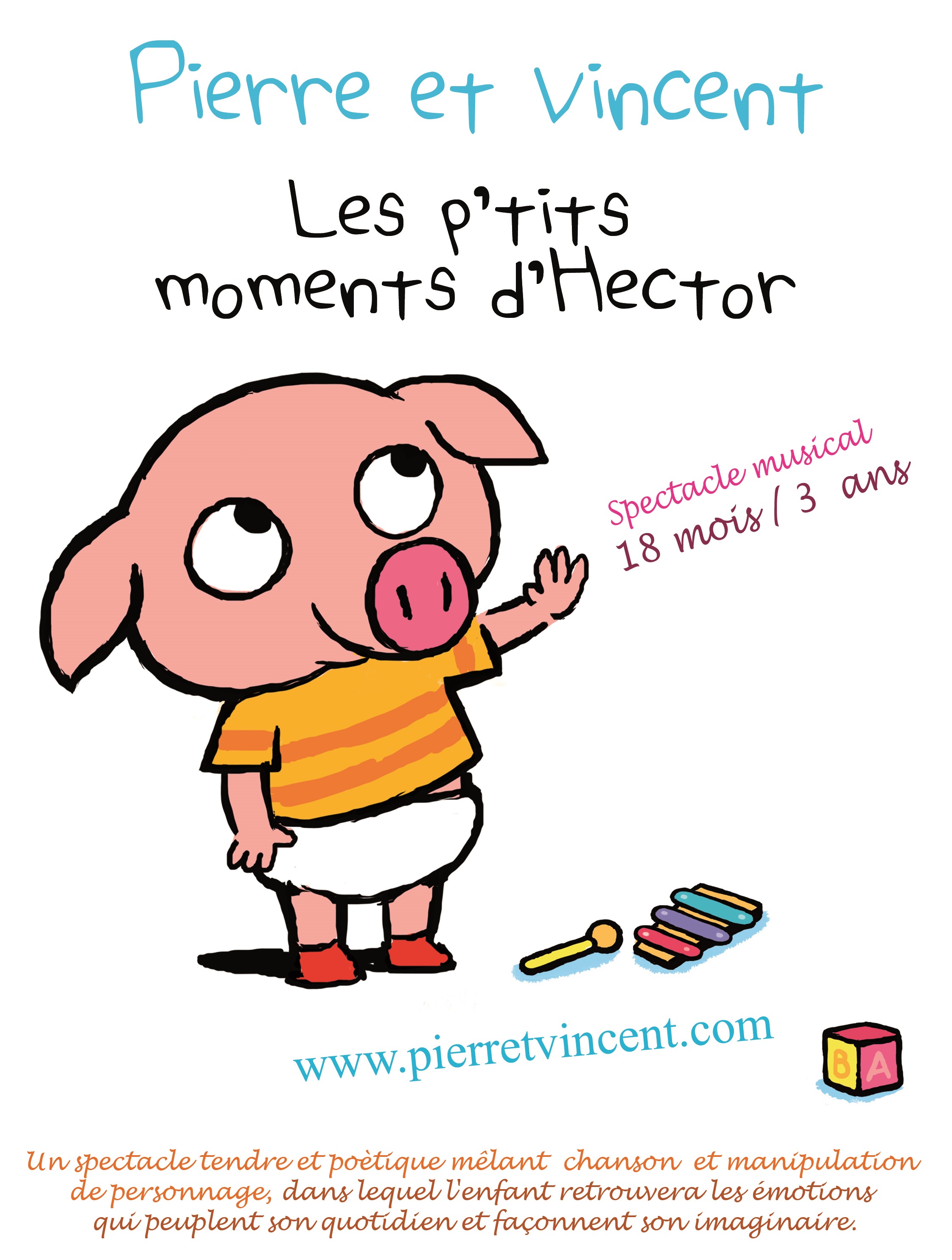 Le duo n’est pas seul sur scène : il se fait trio avec leur complice et compère « Hector », une poupée grandeur nature, dans laquelle l’enfant se reconnaît et retrouve toutes les émotions qui peuplent son quotidien et son imaginaire, avec ses joies, ses rires mais aussi son lot de petits tracas.