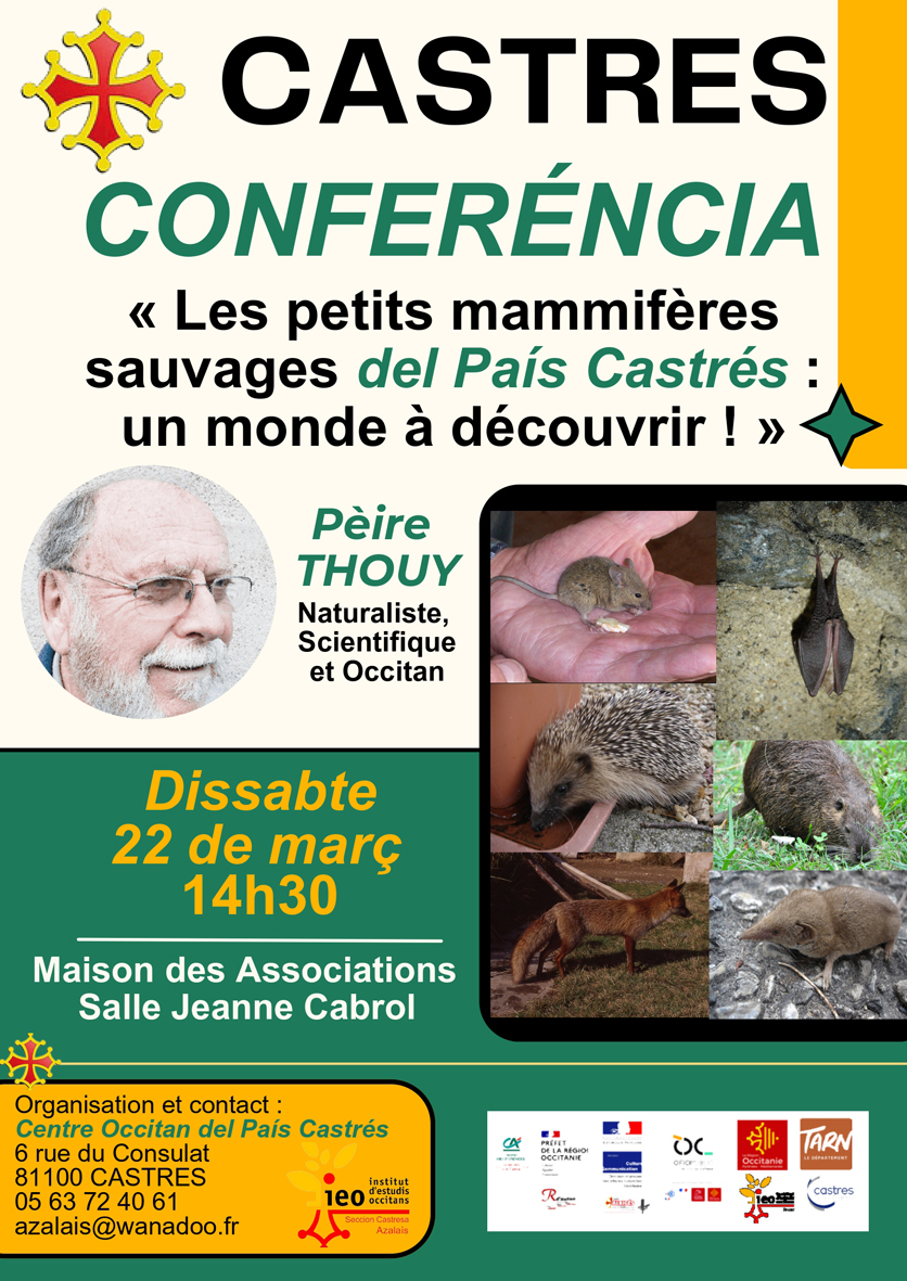 Pèire THOUY viendra nous présenter sa conférence-diaporama « Les petits mammifères sauvages del País Castrés : un monde à découvrir ! », le samedi 22 mars 2025, à 14h30, à la salle Jeanne Cabrol de la Maison des Associations (Place du 1er Mai - 81100 Castres).