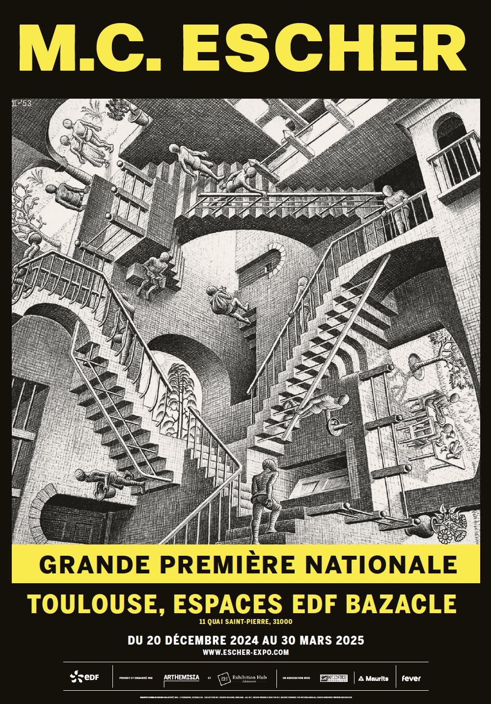 Du 20 décembre 2024 au 30 mars 2025, les Espaces EDF Bazacle accueillent à Toulouse, « M.C. ESCHER », une grande exposition consacrée à Escher, l’artiste des géométries et des mondes impossibles, l’un des artistes les plus appréciés du XXe siècle et une star mondiale du box-office.
