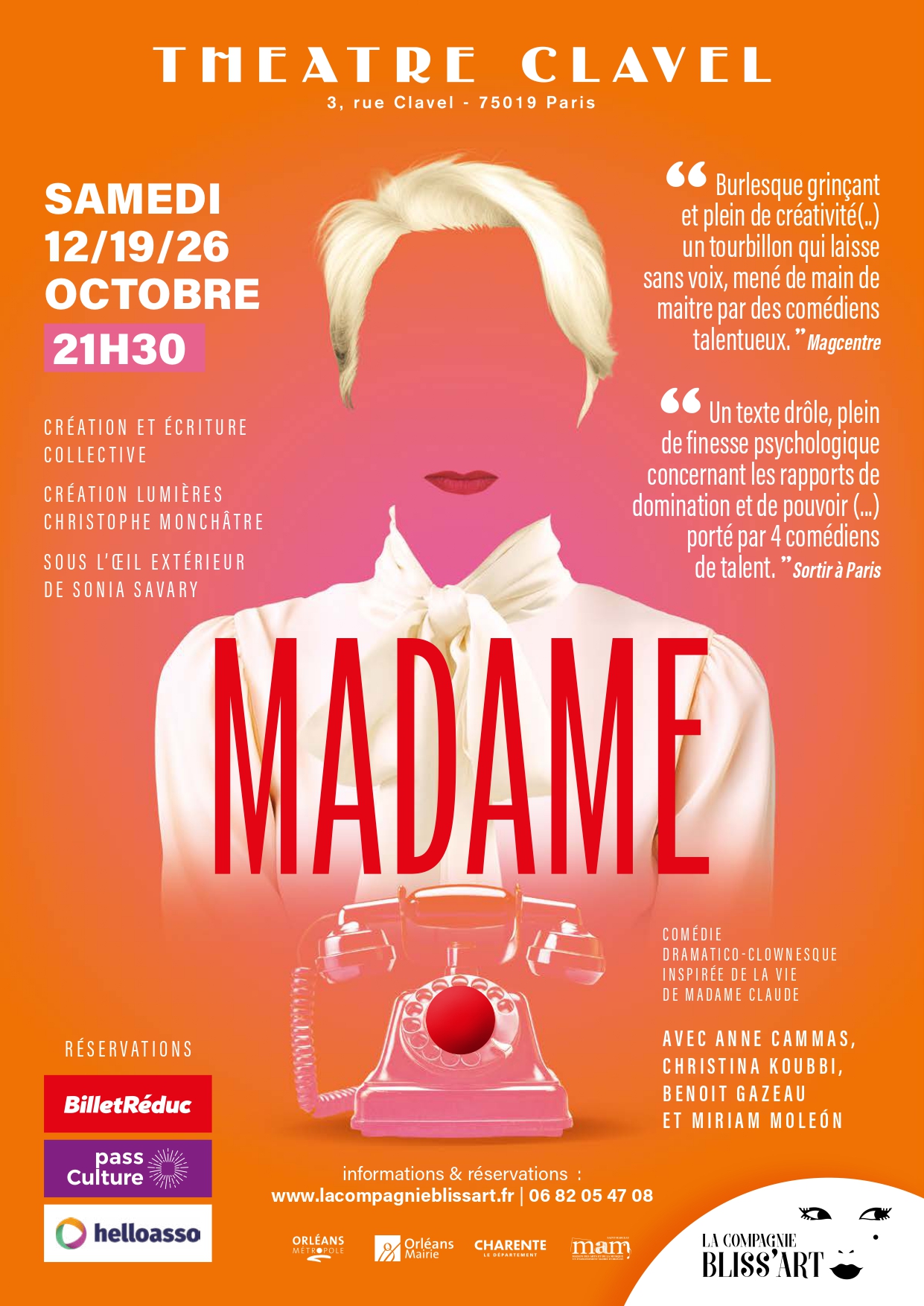 Madame est une pièce étonnante à découvrir au Théâtre Clavel à Paris pour trois dates en octobre : les samedi 12, 19 et 26 octobre 2024. La pièce raconte l’histoire de Madame Claude sur un mode clownesque, et impose son décalage, son humour grinçant, pour finir sur une réflexion sur la domination masculine. Imparable !