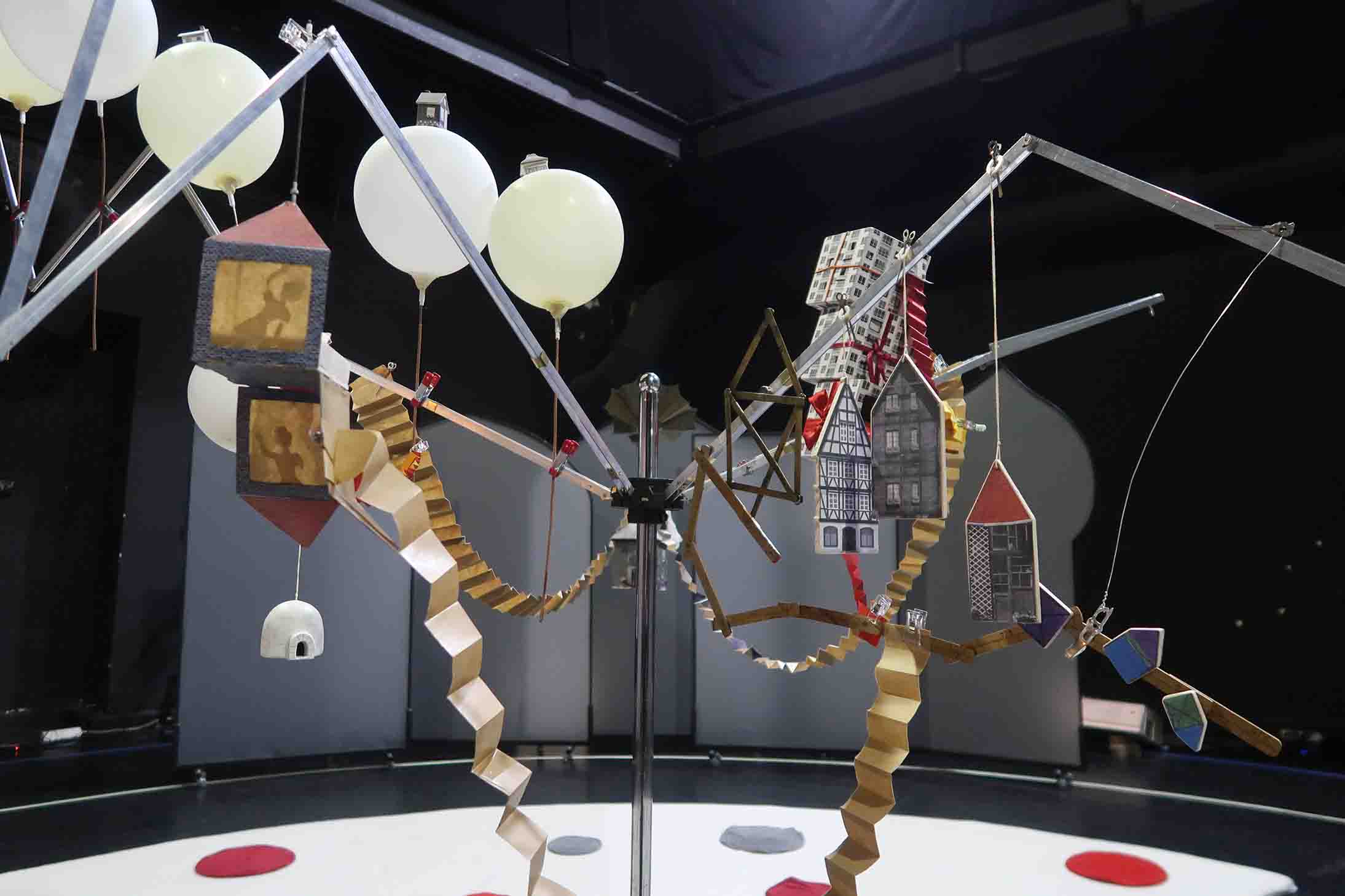 Au début, il n’y a rien… ou presque. Il y a quand même une petite scène tout au milieu… Une petite scène ronde… Comme la terre, comme le ventre de maman. De là… il y a trois chemins qui partent tout droit… Ils partent vers un autre chemin tout rond, tout autour des enfants. Et sur ce chemin il y a des écrans tous blancs mais qui changent, qui bougent… un peu… beaucoup, avec plein d’images et de couleurs. ET, à la fin… il y a un mobile qui tourne… qui tourne au-dessus de nos têtes… avec des maisons perchées sur les branches… tout doucement… peut-être aussi un peu moins doucement…