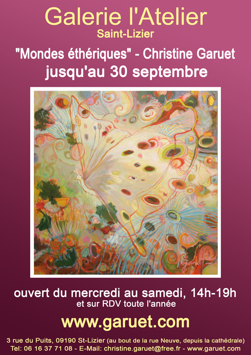 « Mondes éthériques », la série de peintures de Christine Garuet, est issue de petits formats réalisés en 2015. L’artiste par le biais de la figuration libre, expose des scènes imaginaires parfois proches de l’abstraction, inspirées d’expériences dans les domaines ésotériques. Monde onirique et coloré, où chaque toile a son propre univers. Les formats ont changés, on trouve aujourd’hui de grands et moyens formats, à l’acrylique sur toile.