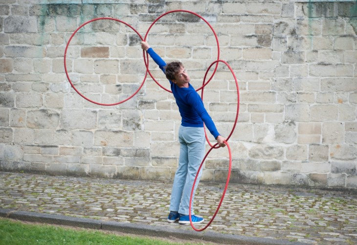 Une courte pièce entre danse, manipulation et théâtre, avec toujours les cerceaux au milieu, et Monsieur O qui à force de s’agiter devient aussi rouge qu’eux.