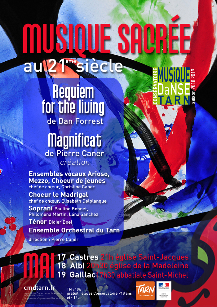 Le Conservatoire de Musique et de Danse du Tarn réunit 150 musiciens engagés dans un beau travail collectif autour d’un répertoire de musique sacrée du 21ème siècle. Le concert auront lieu le vendredi 17 mai 21h église Saint-Jacques Castres. Ce programme permet la rencontre des ensembles vocaux Arioso, Mezzo, du choeur de jeunes de Castres sous la direction de Christine Caner avec le choeur le Madrigal dirigé par Elisabeth Delplanque et l’Ensemble orchestral du Tarn. Les solos seront assurés par Philomena Martin, Pauline Bonnet, Léna Sanchez, soprani et Didier Boël, ténor. La direction musicale est confiée à Pierre Caner. Les deux oeuvres choisies : Requiem for the living de Dan Forrest (2013) et Magnificat de Pierre Caner (2019) allient le riche héritage de la musique sacrée à l’écriture contemporaine. Elles ouvrent un dialogue entre passé et présent avec des compositeurs qui donnent une nouvelle lecture de l’art sacré.