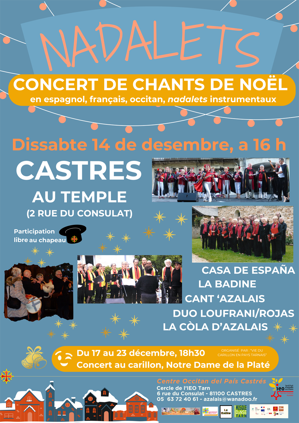 Le Centre Occitan del Pais Castrés va proposer des Nadalets, (mot occitan signifiant « Petits Noëls ») le samedi 14 décembre 2024, à 16h, au Temple (2 rue du Consulat - 81100 Castres).