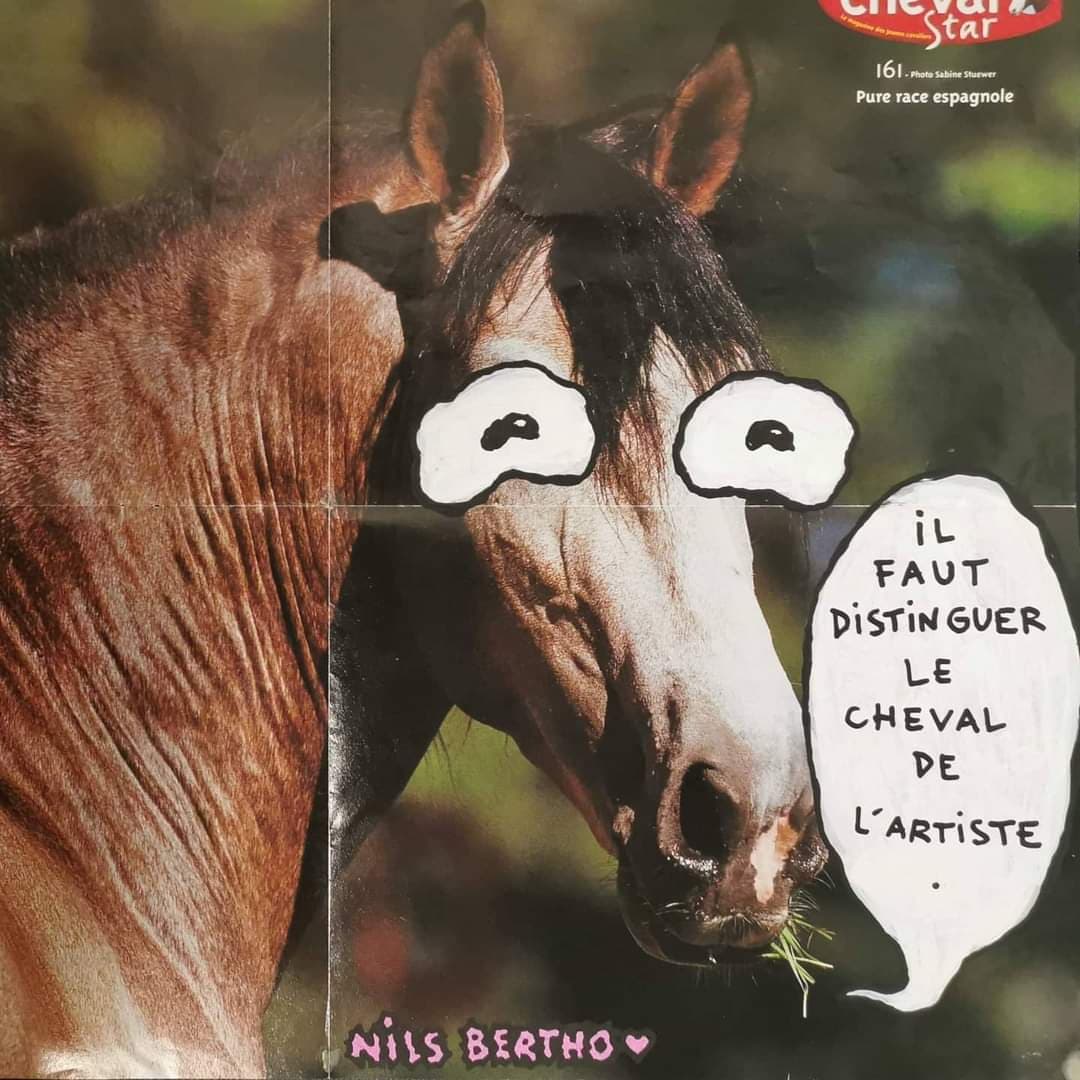 Nils Bertho, artiste prolifique français passionné de cultures underground et dessinateur compulsif parfois chanteur dans Adolf Hibou, tatoueur ou éditeur, qui a choisi de partir dans tous les sens. Illustrateur équestre allergique aux chevaux, Nils Bertho débute en 2020 la série de posters "Ca m’a pris très tôt d’aller au galop" lors d’une résidence Plus Zéro sur une collection adolescente de posters Cheval-Stars de Xavier De Kepper. Il est depuis devenu l’homme qui fait parler les chevaux. Un poster cheval, de la chirurgie oculaire, et de la télépathie équestre.