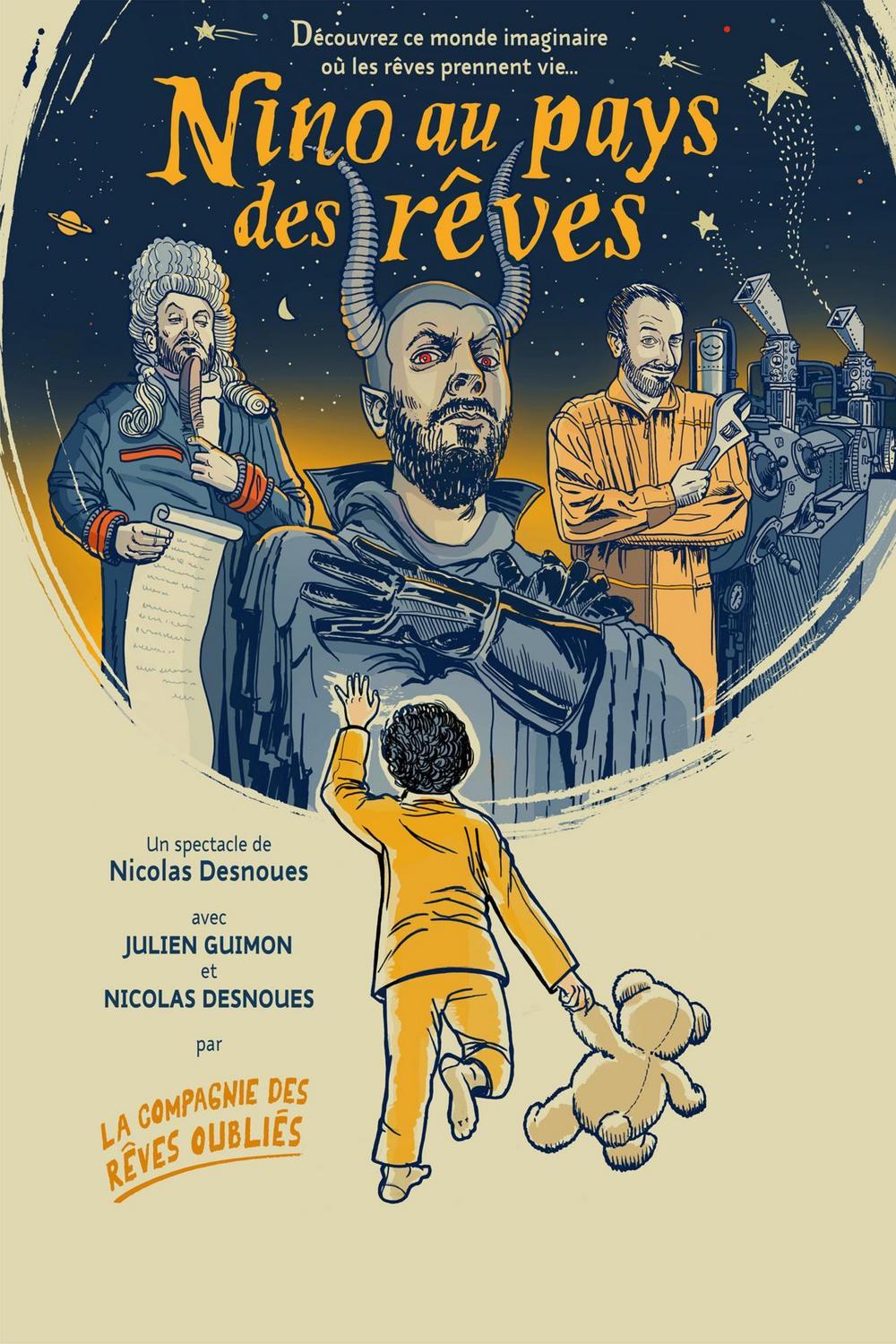 Une nuit, alors qu’il veille tard, Nino se retrouve transporté au pays des rêves. Il va alors rencontrer les personnages qui façonnent les rêves... et les cauchemars. Mais une menace pèse sur ce pays magique et les rêves risquent de disparaitre. Nino parviendra-t-il à les sauver ? Pour son premier spectacle jeune public, la compagnie propose un conte initiatique sur l’émerveillement, l’enfance et la place accordée à l’imaginaire. Un retour à l’enfance pour les parents, un rêve éveillé pour les enfants.
