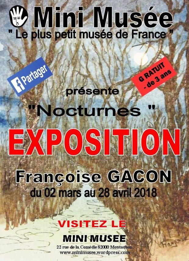 "Nocturnes", une exposition de miniatures de Françoise Gacon, du 02 mars au 28 avril 2018, au Mini-Musée de Montauban. Françoise Gacon expose au Mini-Musée, ses créations originales, sur le thème des paysages vus la nuit. Ses œuvres sont réalisées à la peinture à l’huile sur des toiles dans un format miniature de 10cm X 10cm. Plus que toutes autres choses, la nuit est pour la créatrice très inspirante. Elle agit comme un philtre puissant qui inonde le silence intérieur de l’artiste. Comme une voix qui murmure, la nuit lui donne une vision onirique, d’un paradis silencieux où les étoiles, la lune et les ombres s’animent, pour rendre un hommage muet à la voûte céleste.