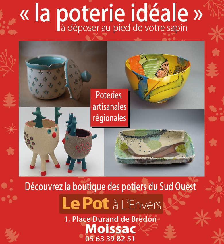 Tout le mois de décembre les 12 céramistes exposants de notre boutique associative Le Pot à l’Envers, située juste en face de la célèbre abbaye de Moissac, vous accueillent à tour de rôle pour vous faire découvrir leurs toutes dernières créations. Vaisselle, bijoux, sculptures, décoration, luminaires, objets pour le jardin, mangeoires à oiseaux, nichoirs, une grande diversité de propositions, réalisées dans nos différents ateliers, pour vous permettre de trouver la poterie idéale à mettre sous le sapin !