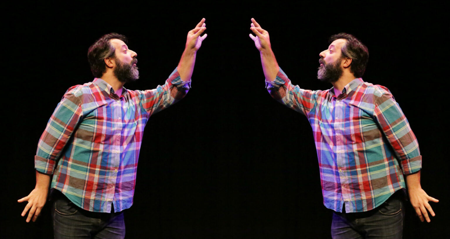 Un seul comédien sur scène improvise mille histoires et cent mille personnages, avec l’aide de petites phrases écrites par les spectateur·ice·s, de petits objets et d’éventuels décors qui se trouvent dans le lieu qui accueille le spectacle.
