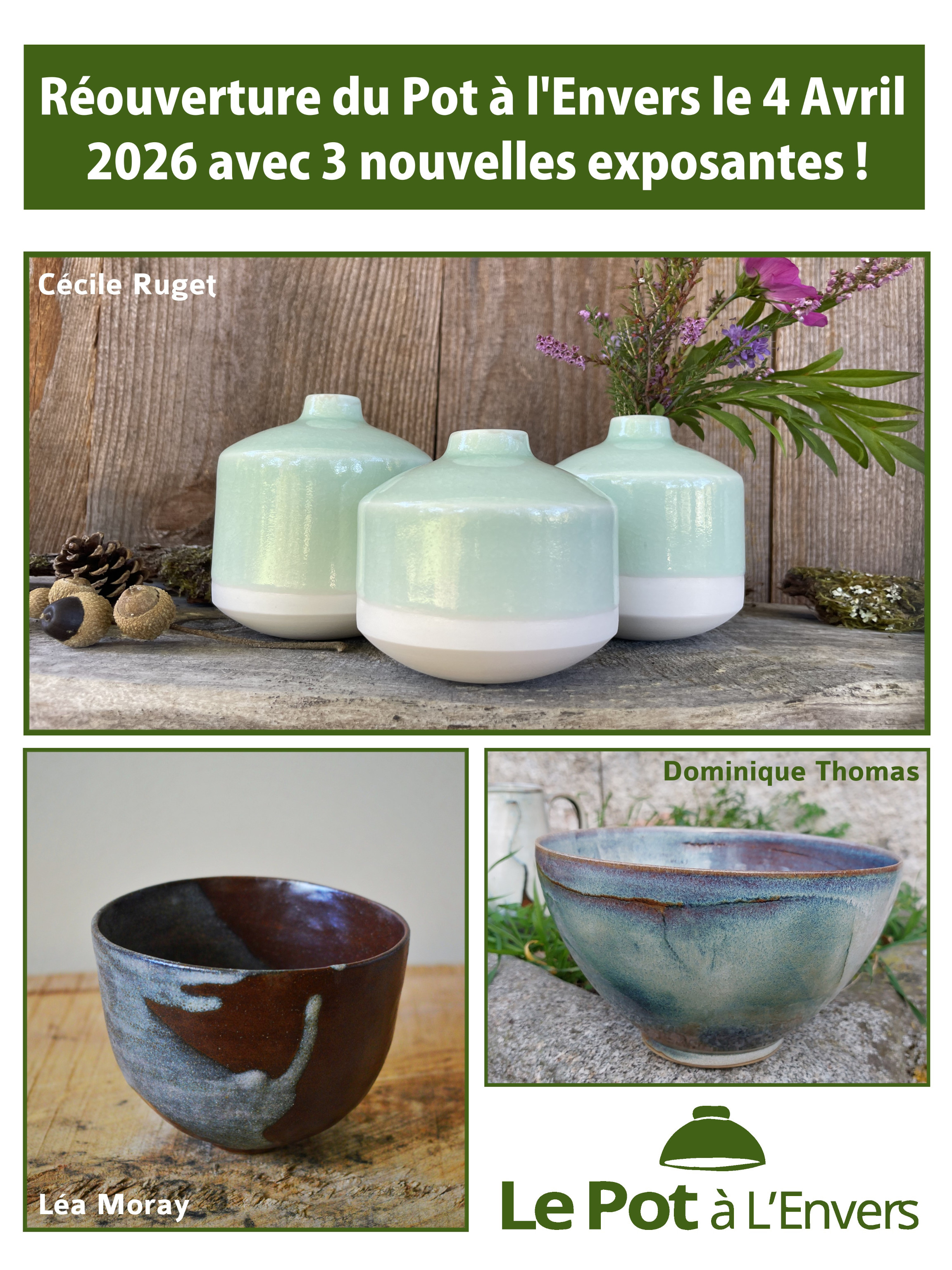 Le Pot à l’Envers est une boutique associative réunissant 11 potiers et potières. Ils vous accueillent eux-mêmes à tour de rôle pour vous faire découvrir le travail issu de leurs ateliers, tous situés dans les alentours, aussi les horaires d’ouverture s’ajustent au fil de la saison.