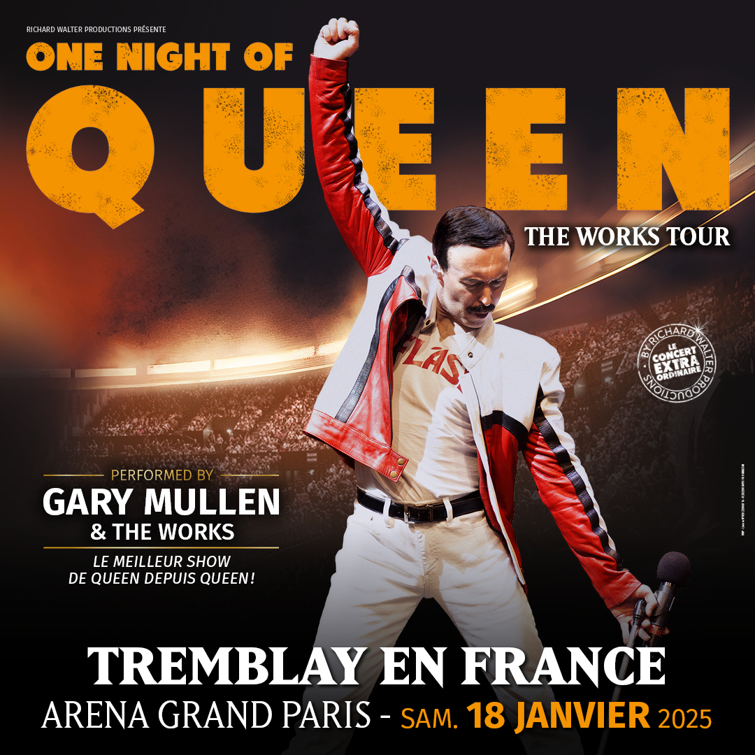 ONE NIGHT OF QUEEN est plus que jamais, le spectacle hommage à Queen le plus authentique, le plus abouti et le plus impressionnant qui n’ait jamais été présenté sur scène. Reprenant les tubes les plus légendaires du groupe mythique durant un spectacle fascinant de plus de deux heures, vous serez emporté par la magie et la puissance de Bohemian Rhapsody, A kind of Magic, Friends will be Friends, Under Pressure, One Vision, Somebody to love, I want to break Free...