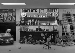 L’exposition Bimbeloterie se présente comme une grande traversée dans l’œuvre d’Olivier REBUFA, photographe autodidacte qui, dès la fin des années 80, entreprit de mettre en scène sa propre image dans un univers constitué de poupées Barbie, figurines, Lego et autres jouets. Dans cet ère pré-numérique où la photographie est encore argentique et photoshop balbutiant, l’artiste se fait artisan et metteur en scène, un peu à l’image du cinéaste Georges Méliès, auquel il rend d’ailleurs hommage dans l’une de ses œuvres. Il recourt à des bricolages simples et astucieux dans son atelier, couche sur le papier les croquis de ses projets et collecte au fil de ses pérégrinations dans des vide-greniers et autres lieux tous les objets miniaturisés imaginables. Ainsi, pour intégrer son autoportrait au milieu des poupées et autres accessoires, il réalise en studio sur fond noir un autoportrait « en situation » qu’il tire sur papier réduit à l’échelle d’une poupée Barbie. Fixé au dos du tirage découpé, un simple fil de fer suffit à maintenir la silhouette dans la scène désirée. Une fois la mise en scène photographiée, l’autoportrait en deux dimensions et les objets en trois dimensions fusionnent en quelque sorte, donnant l’illusion d’une cohabitation harmonieuse.