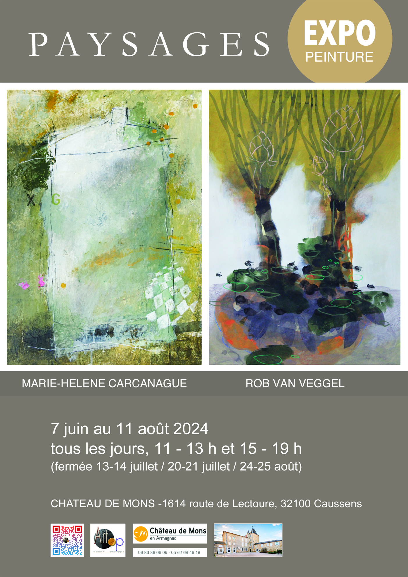 Au château de Mons, deux artistes peintres sont invités à l’initiative de Christophe Bassetto dirigeant ARTOP, autour du thème classique du Paysage(s). Marie Hélène Carcanague, résidant à Toulouse et Rob Van Veggel, gersois, confrontent leurs productions. 2 points de vue différents mais une gamme de couleurs proches. Si la première aborde la notion du temps qui passe par ses matières usées, griffées laissant apparaitre quelques écritures et autres habitations désertées, le second est davantage dans le paysage originel, vierge de toute présence animale. Le temps, là encore, semble nous échapper.