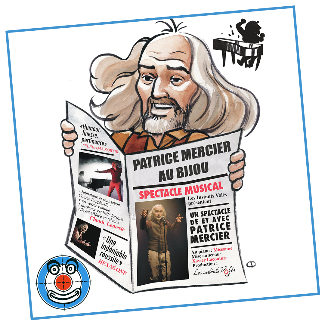 Doté d’un sens de la dérision hors norme, et accompagné par Missonne au piano, Patrice Mercier vous en fera voir de toutes les couleurs : humour noir et rire jaune en priorité !