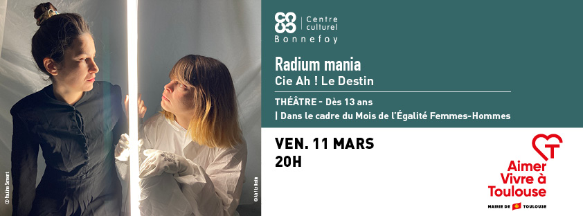 Radium Mania est un spectacle sur la figure de Marie Curie, surnommée Mania. En rejouant sous une forme ludique et décalée les moments-clés de son existence, deux comédiennes mettent en lumière les mécanismes de domination qui ont longtemps exclu les femmes de la communauté scientifique et qui ont fait de Marie Curie une pionnière.