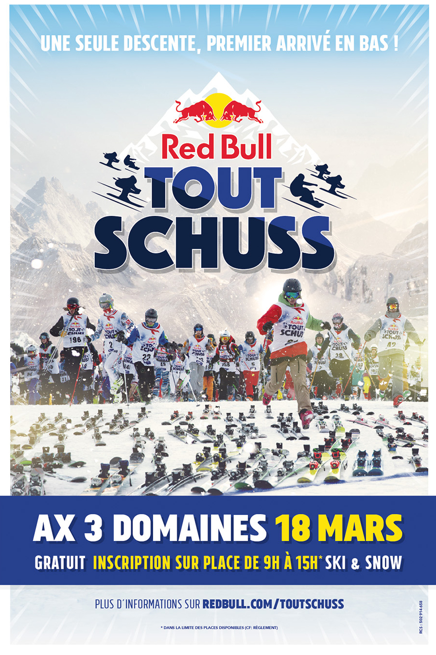C’est reparti pour le Red Bull Tout Schuss, après Les Orres, Ax 3 Domaines va accueillir la deuxième étape de l’édition 2017, ce samedi 18 mars. Le concept de cet événement déjanté est simple : un départ de groupe massif et spectaculaire des participant(e)s dévalant la même piste avec pour objectif d’arriver en station en premier !